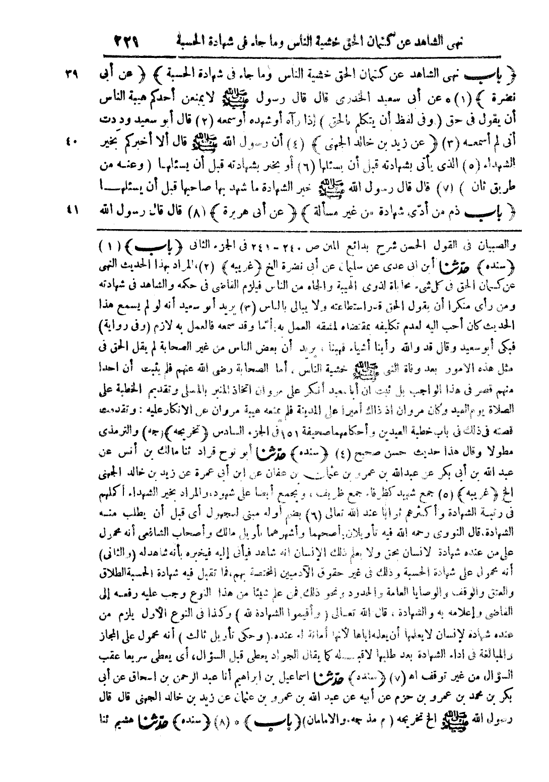 والصبيان في القول الحسن شرح بدائع المتن ص 240 - 241 في الجزء الثاني (باب) (1) (سنده) حدّثنا أبن أبى عدي عن سليمان عن أبى نضرة الخ (غريبة) (2) المراد بهذا الحديث النهى عن كمان الحق في كل شيء محاباة لذوي الهيبة والجاة من الناس فيلزم القاضي في حكمة والشاهد في شهادته ومن رأي منكرًا أن يقول الحق قدرًا استطاعته ولا يبالى بالناس (3) يريد أبو سعيد أنه لو لم يسمع هذا الحديث كان أحب إليه لعدم تكليفه بمقتضاه لمشقة العمل به: أمّا وقد سمعه فالعمل به لازم (وفي رواية) فبكي أبو سعيد وقال قد والله رأينا أشياء فهبنا، يريد أن بعض الناس من غير الصحابة لم يقل الحق في مثل هذه الأمور بعد وفاة النبي (صلى الله عليه وسلم) خشية الناس، أما الصحابة رضي الله عنهم فلم يثبت أن أحدًا منهم قصر في هذا الواجب بل ثبت أن أبا سعيد أنكر على مروان اتخاذ المنبر بالمصلى وتقديم الخطبة على الصلاة يوم العيد وكان مروان إذا ذاك أميرًا على المدينة فلم يمنعه هيبة مروان عن الإنكار عليه: وتقدمت قصته في ذلك في باب خطبة العيدين وأحكامهما صحيفة 151 في الجزء السادس (تخريجه) (جه) والترمذي مطولاً وقال هذا حديث حسن صحيح (4) (سنده) حدّثنا أبو نوح قراد ثنا مالك بن أنس عن عبد الله بن أبي بكر عن عبد الله بن عمرو بن عثمان بن عفان عن أبن أبى عمرة عن زيد بن خالد الجهني الخ (غريبة) (5) جمع شهيد كظرفاء جمع ظريف، ويجمع أيضًا على شهود والمراد بخير الشهداء أكملهم في رتبة الشهادة وأكثرهم ثوابًا عند الله تعالى (6) بضم أوله مبني لمجهول أي قبل أن يطلب منه الشهادة، قال النووي رحمه الله فيه تأويلان أصحهما وأشهرهما تأويل مالك وأصحاب الشافعي أنه محمول على من عنده شهادة لإنسان بحق ولا يعلم ذلك الإنسان أنه شاهد فيأتي إليه فيخبره بأنه شاهد له (والثاني) أنه محمول على شهادة الحسبة وذلك في غير حقوق الآدميين المختصة بهم، فما تقبل فيه شهادة الحسبة الطلاق والعتق والوقف والوصايا العامة والحدود ونحو ذلك فمن علم شيئًا من هذا النوع وجب عليه رفعه إلى القاضي وإعلامه به والشهادة، قال الله تعالى (وأقيموا الشهادة لله) وكذا في النوع الأول يلزم من عنده شهادة لإنسان لا يعلمها أن يعلمه إياها لأنها أمانة له عنده (وحكي تأويل ثالث) أنه محمول على المجاز والمبالغة في أداء الشهادة بعد طلبها لا قبله كما يقال الجواد يعطي قبل السؤال، أي يعطي سريعًا عقب السؤال من غير توقف أهـ (7) (سنده) حدّثنا إسماعيل بن إبراهيم أنا عبد الرحمن بن إسحاق عن أبى بكر بن محمد بن عمرو بن حزم عن أبيه عن عبد الله بن عمرو بن عثمان عن زيد بن خالد الجهني قال قال وصول الله (صلى الله عليه وسلم) الخ تخريجه (م مذجه، والإمامان) (باب) (8) (سنده) حدّثنا هشيم ثنا