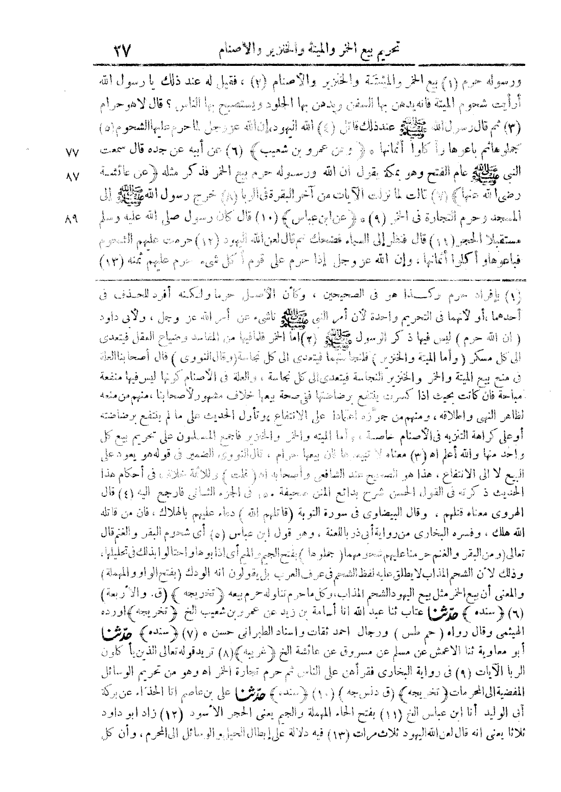ورسوله حرم (1) بيع الخمر والميتة والخنزير والأصنام (2)، فقيل له عند ذلك يا رسول الله أرأيت شحوم الميتة فانه يدهن بها السفن ويدهن بها الجلود ويستصبح بها الناس؟ قال لا هو حرام (3) ثم قال رسول الله صلَّى الله عليه وسلم عند ذلك قاتل (4) الله اليهود، إن الله عز وجل لما حرم عليها الشحوم (5) جملوها ثم باعوها وأكلوا أثمانها، (وعن عمرو بن شعيب) (6) عن أبيه عن جده قال سمعت النبي صلَّى الله عليه وسلم عام الفتح وهو بمكة يقول ان الله ورسوله حرم بيع الخمر فذكر مثله (عن عائشة رضي الله عنها) (7) قالت لما نزلت الآيات من آخر البقرة في الربا (8) خرج رسول الله إلى المسجد وحرم التجارة في الخمر (9)، (عن ابن عباس) (10) قال كان رسول الله صلَّى الله عليه وسلم مستقبلا الحجر (11) قال فنظر إلى السماء فضحك ثم قال لعن الله اليهود (12) حرمت عليهم الشحوم فباعوها وأكلوا أثمانها، وإن الله عز وجل إذا حرم على قوم أكل شيء حرم عليهم ثمنه (13)