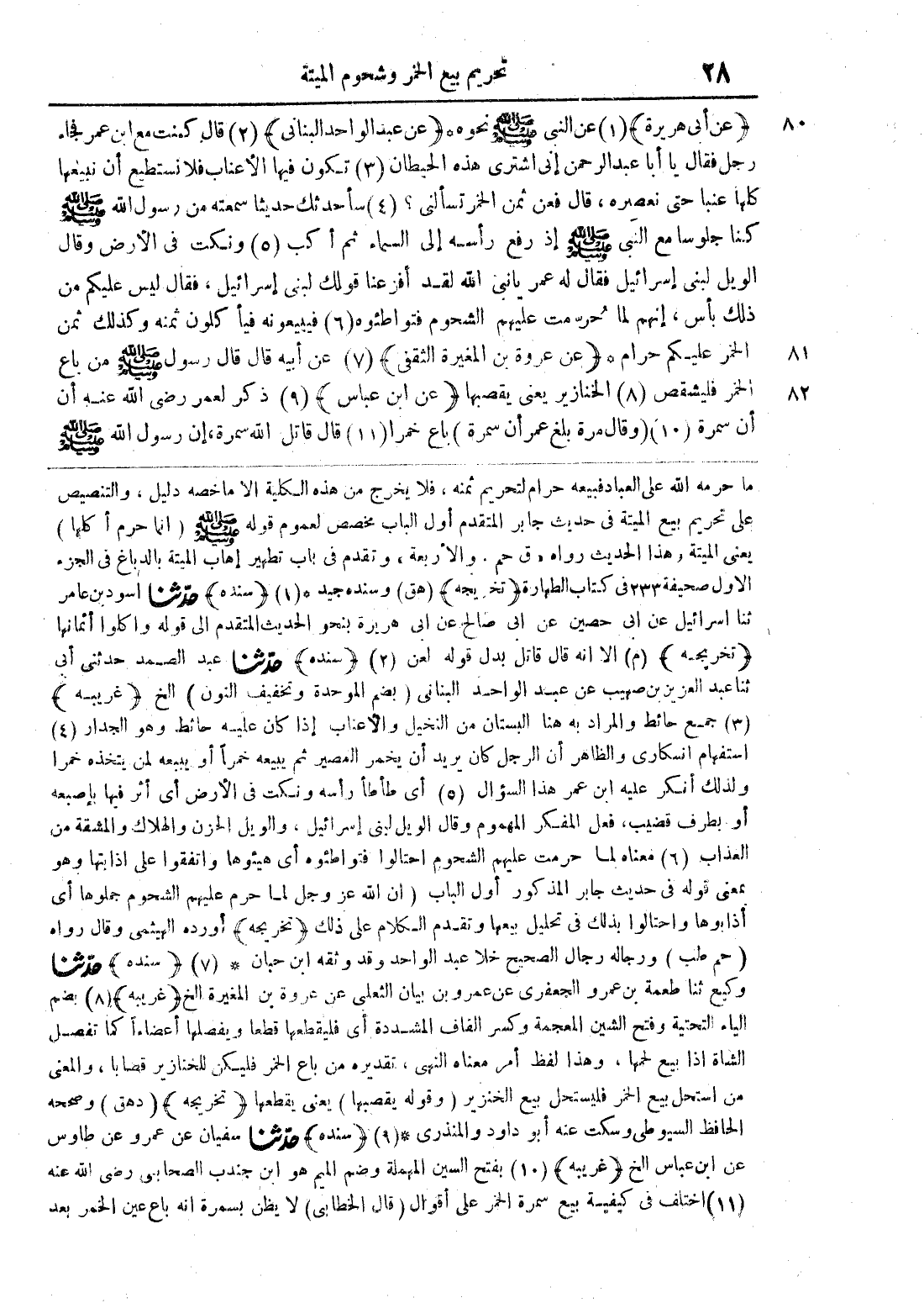 (عن أبي هريرة) (1) عن النبي صلَّى الله عليه وسلم نحوه (عن عبد الواحد البناني) (2) قال كنت مع ابن عمر فجاء رجل فقال يا أبا عبد الرحمن إني اشتري هذه الحيطان (3) تكون فيها الأعناب فلا نستطيع أن نبيعها كلها عنبا حتى نعصره، قال فعن ثمن الخمر تسألني؟ (4) سأحدثك حديثا سمعته من رسول الله صلَّى الله عليه وسلم كنا جلوسا مع النبي صلَّى الله عليه وسلم إذ رفع رأسه إلى السماء ثم أكب (5) ونكت في الأرض وقال الويل لبني إسرائيل فقال له عمر يا نبي الله لقد أفزعنا قولك لبني إسرائيل، فقال ليس عليم من ذلك بأس، إنهم حرّمت عليهم الشحوم فتواطئوه (6) فيبيعونه فيأكلون ثمنه وكذلك ثمن الخمر عليكم حرام، (عن عروة بن المغيرة الثقفي) (7) عن أبيه قال قال رسول الله صلَّى الله عليه وسلم من باع الخمر فليشقص (8) الخنازير يعني يقصبها (عن ابن عباس) (9) ذكر لعمر رضي الله عنه أن أن سمرة (10) (وقال مرة بلغ عمر أن سمرة) باع خمرا (11) قال قاتل الله سمرة، إن رسول الله صلَّى الله عليه وسلم