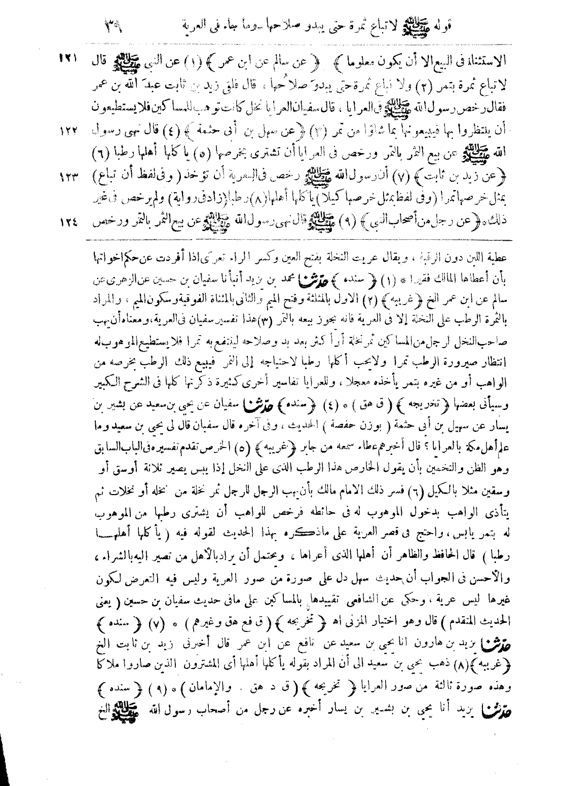 الاستثناء في البيع غلا أن يكون معلوما) (عن سالم عن ابن عمر) (1) عن النبي صلى الله عليه وسلم قال لا تباع ثمرة بتمر (2) ولا تباع ثمرة حتى يبدو صلاحها، قال فلقي زيد بن ثابت عبد الله بن عمر فقال رخص رسول الله صلى الله عليه وسلم في العرايا، قال سفيان العرايا نخل كانت توهب للمساكين فلا يستطيعون أن ينتظروا بها فيبيعونها بما شاؤا من تمر (3) (عن سهل بن أبي حثمة) (4) قال نهي رسول الله صلى الله عليه وسلم عن بيع الثمر بالتمر ورخص في العرايا أن تشتري بخرصها (5) يأكلها أهلها رطبا (6) (عن زيد بن ثابت) (7) أن رسول الله صلى الله عليه وسلم رخص في العرية أن تؤخذ (وفي لفظ أن تباع) بمثل خرصها تمرا (وفي لفظ لمثل خرصها كيلا) يأكلها أهلها (8) رطبا (زاد في رواية) ولم يرخص في غير ذلك (عن رجل من أصحاب النبي) (9) صلى الله عليه وسلم قال نهي رسول الله صلى الله عليه وسلم عن بيع الثمر بالتمر ورخص