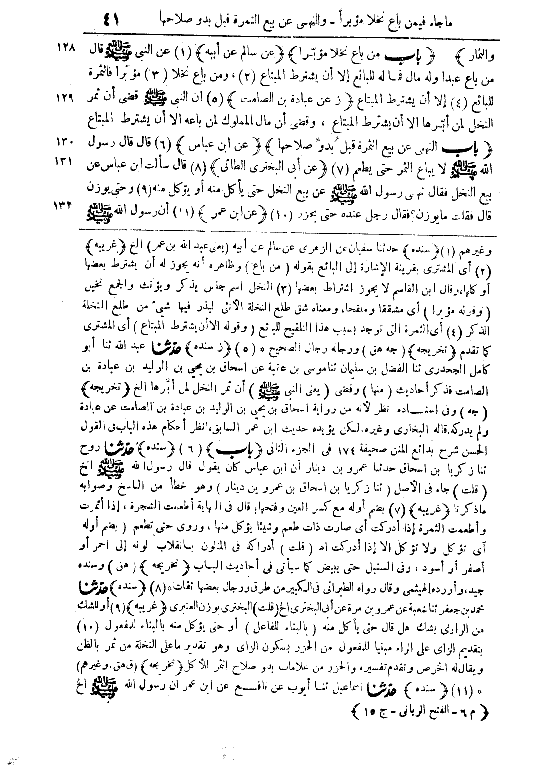 وغيرهم (1) (سنده) حدثنا سفيان عن الزهري عن سالم عن أبيه (يعني عبد الله بن عمر) الخ (غريبه) (2) أي المشتري بقرينة الإشارة إلى البائع بقوله (من باع) وظاهره أنه يجوز له ان يشترط بعضها أو كلها، وقال ابن القاسم لا يجوز اشتراط بعضها (3) النخل اسم جنس يذكر ويؤنث والجمع نخيل (وقوله مؤبرا) أي مشققا وملقحا، ومعناه شق طلع النخلة الأنثى ليذر فيها شيء من طلع النخلة الذكر (4) أي الثمرة التي توجد بسبب هذا التلقيح للبائع (وقوله إلا ان يشترط المبتاع) أي المشتري كما تقدم (تخريجه) _جه هق) ورجاله رجال الصحيح. (5) (ز سنده) حدّثنا عبد الله ثنا أبو كامل الجحدري ثنا الفضل بن سليمان ثنا موسى بن عقبة عن إسحاق بن يحيي بن الوليد بن عبادة بن الصامت فذكر أحاديث (منها) وقضى (يعني النبي صلى الله عليه وسلم) أن تمر النخل لمن أبَّرها الخ (تخريجه) (جه) وفي اسناده نظر لأنه من رواية إسحاق بن يحيي بن الوليد بن عبادة بن الصمت عن عبادة ولم يدركه. قاله البخاري وغيره لكن يؤيده حديث ابن عمر السابق، انظر أحكام هذه الباب في القول الحسن شرح بدائع المنن صحيفة 174 في الجزء الثاني (باب) (6) (سنده) حدّثنا روح ثنا زكريا بن إسحاق حدثنا عمرو بن دينار أن ابن عباس كان يقول قال رسول الله صلى الله عليه وسلم الخ (قلت) جاء في الأصل (ثنا زكريا بن إسحاق بن عمرو بن دينار) وهو خطأ من الناسخ وصوابه ما ذكرنا (غريبه) (7) بضم أوله مع كسر العين وفتحها، قال في النهاية أطعمت الشجرة، إذا أثمرت وأطعمت الثمرة إذا أدركت أي صارت ذات طعم وشيئا يؤكل منها، وروي حتى تطعم (بضم أوله أي تؤكل ولا تؤكل الا إذا أدركت اهـ (قلت) أدراكه في الملون بانقلاب لونه إلى احمر أو أصفر أو أسود، وفي السنبل حتى يبيض كما سيأتي في أحاديث الباب (تخريجه) (هق) وسنده جيد، وأورده الهيثمي وقال رواه الطبراني في الكبير من طرق ورجال بعضها ثقات. (8) (سنده) حدّثنا محمد بن جعفر ثنا شعبة عن عمرو بن مرة عن أبي البختري الخ (قلت) البختري بوزن العنبري (غريبه) (9) أو للسك من الراوي يشك هل قال حتى يأكل منه (بالبناء للفاعل) أو حتى يؤكل منه بالبناء للمفعول (10) بتقديم الزاي على الراء مبنيا للمفعول من الحرز بسكون الزاي وهو تقدير ما على النخلة من ثمر بالظن ويقال له الخرص وتقدم تفسيره والحرز من علامات بدو صلاح الثمر للأكل (تخريجه) (ق هق. وغيرهم) (11) (سنده) حدّثنا إسماعيل ثنا أيوب عن نافع عن ابن عمر أن رسول الله صلى الله عليه وسلم الخ