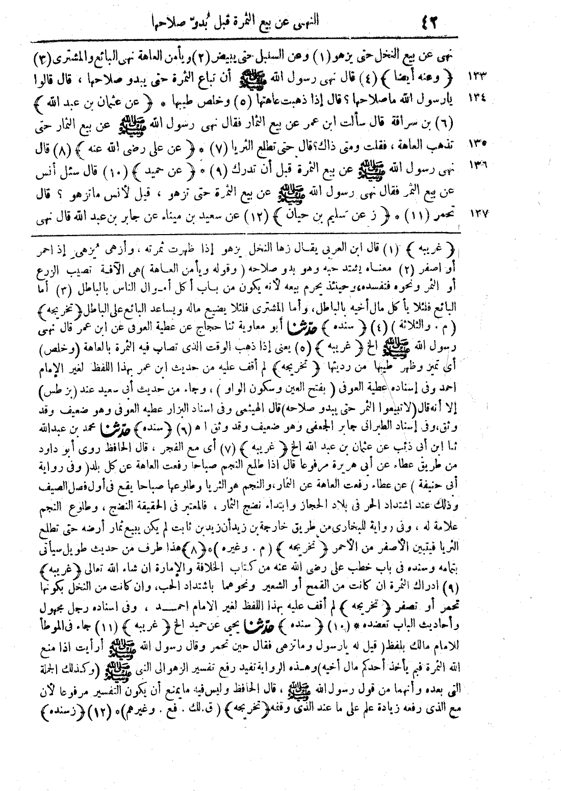 (غريبه) (1) قال ابن العربي يقال زها النخل يزهو إذا ظهرت ثمرته، وأزهى يُزهي إذا احمر أو اصفر (2) معناه يشتد حبه بدو صلاحه (وقوله ويأمن العاهة) هي الآفة تصيب الزرع البائع فلئلا يأكل مال أخيه بالباطل، وأما المشتري فلئلا يضيع ماله ويساعد البائع على الباطل (تخريجه) (م. والثلاثة) (4) (سنده) حدثنا أبو معاوية ثنا حجاج عن عطية العوفي عن ابن عمر قال نهى رسول الله صلى الله عليه وسلم الخ (غريبه) (5) يعني إذا ذهب الوقت الذي تصاب فيه الثمرة بالعاهدة (وخلص) أي تميز وظهر طيبها من رديئها (تخريجه) لم أقف عليه من حديث ابن عمر بهذا اللفظ لغير الإمام أحمد وفي إسناده عطية العوفي (بفتح العين وسكون الواو)، وجاء من حديث أبي سعيد عند (بز طس) وثق، وفي إسناده الطبراني جابر الجعفي وهو ضعيف وقد وثق هـ (6) (سنده) حدثنا محمد بن عبد الله ثنا ابن أبي ذئب عن عثمان بن عبد الله الخ (غريبه) (7) أي مع الفجر، قال الحافظ روى أبو داود من طريق عطاء عن أبي هريرة مرفوعًا قال إذا طلع النجم صباحًا رفعت العاهة عن كل بلد (وفي رواية أبي حنيفة) عن عطاء رفعت العاهة عن الثمار، والنجم هو الثريا وطلوعها صباحًا يقع في أول فصل الصيف وذلك عند اشتداد الحر في بلاد الحجاز وابتداء نضج الثمار، فالمعتبر في الحقيقة النضج، وطلوع النجم علامة له، وفي رواية للبخاري من طريق خارجة بن زيد أن زيد بن ثابت لم يكن يبيع ثمار أرضه حتى تطلع الثريا فيتبين الأصفر من الأحمر (تخريجه) (م. وغيره) * (8) هذا طرف من حديث طويل سيأتي بتمامه وسنده في باب خطب علي رضي الله عنه من كتاب الخلافة والإمارة إن شاء الله تعالى (غريبه) (9) إدراك الثمرة إن كانت من القمح أو الشعير ونحوهما باشتداد الحب، وإن كانت من الخيل بك ونها تحمر أو تصفر (تخريجه) لم أقف عليه بهذا اللفظ لغير الإمام أحمد، وفي إسناده رجل مجهول وأحاديث الباب تعضده* (10) (سنده) حدثنا يحيى عن حميد الخ (غريبه) (11) جاء في الموطأ للإمام مالك بلفظ (قيل له يا رسول الله وما تزهى فقال حين تحمر وقال رسول الله صلى الله عليه وسلم أرأيت إذا منع الله الثمرة فيم يأخذ أحدكم مال أخيه) وهذه الرواية تفيد رفع تفسير الزهو إلى النبي صلى الله عليه وسلم (وكذلك الجملة التي بعده وأنهما من قول رسول الله صلى الله عليه وسلم، قال الحافظ وليس فيه ما يمنع أن يكون التفسير مرفوعًا لأن مع الذي رفعه زيادة علم على ما عند الذي وقفه (تخريجه) (ق. لك. فع. وغيرهم) * (ز سنده)
