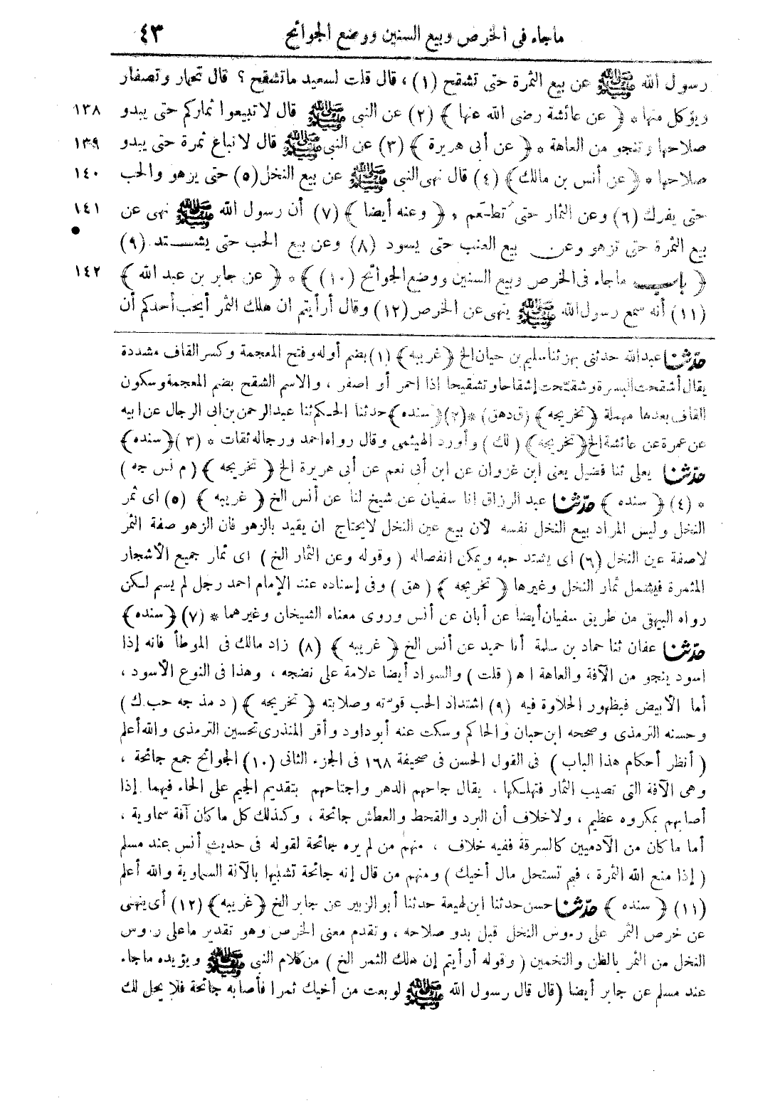 رسول الله صلى الله عليه وسلم عن بيع الثمرة حتى تشقح (1)، قال قلت لسعيد ما تشقح؟ قال تحمار وتصفار ويؤكل منها* (عن عائشة رضي الله عنها) (2) عن النبي صلى الله عليه وسلم قال لا تبيعوا ثماركم حتى يبدو صلاحها وتنجو من العاهة* (عن أبي هريرة) (3) عن النبي صلى الله عليه وسلم قال لا تباع ثمرة حتى يبدو صلاحها* (عن أنس بن مالك) (4) قال نهى النبي صلى الله عليه وسلم عن بيع النخل (5) حتى يزهو والحب حتى يفرك (6) وعن الثمار حتى تُطعم، (وعنه أيضًا) (7) أن رسول الله صلى الله عليه وسلم نهى عن بيع الثمرة حتى تزهو وعن بيع العنب حتى يسود (8) وعن بيع الحب حتى يشتد (9) (باب ما جاء في الخرص وبيع السنين ووضع الجوائح (10)) * (عن جابر بن عبد الله) (11) أنه سمع رسول الله صلى الله عليه وسلم ينهى عن الخرص (12) وقال أرأيتم إن هلك الثمر أيحب أحدكم أن