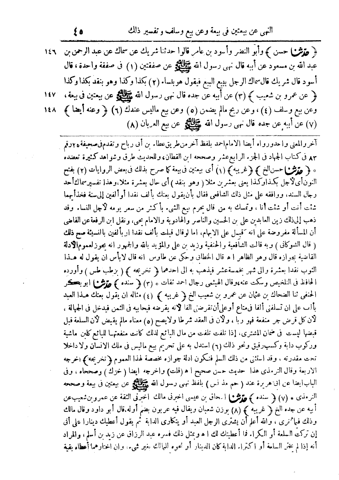 آخر والمعنى واحد ورواه أيضًا الإمام أحمد بلفظ آخر من طريق عطاء بن أبي براح وتقدم في صحيفة 25 رقم 83 في كتاب الجهاد في الجزء الرابع عشر وصححه ابن القطان، وللحديث طرق وشواهد كثيرة تعضده* (حدثنا حسن الخ) (غريبه) (1) أي بيعتين في بيعة كما صرح بذلك في بعض الروايات (2) بفتح النون أي لأجل بكذا وكذا يعني بعشرين مثلًا (وهو بنقد) أي حال بعشرة مثلًا، وهذا تفسير سماك أحد رجال السند، ووافقه على مثل ذلك الشافعي فقال بأن يقول بعتك بألف نقدًا أو ألفين إلى سنة فخذ أيهما شئت أنت أو شئت أنا، وتمسك به من قال يحرم بيع الشيء بأكثر من سعر يومه لأجل النساء وقد ذهب إلى ذلك زين العابدين علي بن الحسين والناصر والهادوية والإمام يحيى، ونقل ابن الرفعة عن القاضي أن المسألة مفروضة على أنه قَبِل على الإبهام، أما لو قال قبلت بألف نقدًا أو بألفين بالنسيئة صح ذلك (قال الشوكاني) وبه قالت الشافعية والحنفية وزيد بن علي والمؤيد بالله والجمهور أنه يجوز لعموم الأدلة القاضية بجوازه قال وهو الظاهر اهـ قال الخطابي وحكى عن طاوس أنه قال لا بأس أن يقول له هذا الثوب نقدًا بعشرة وغلى شهر بخمسة عشر فيذهب به أحدهما (تخريجه) (بز طب طس) وأورده الحافظ في التلخيص وسكت عنه، وقال الهيثمي رجال أحمد ثقات* (3) (سنده) حدثنا أبو بكر الحنفي ثنا الضحاك بن عثمان عن عمرو بن شعيب الخ (غريبه) (4) مثاله أن يقول بعتك هذا العبد بألف على أن تسلفني ألفًا في متاع أو على أن تقرضني ألفًا لأنه يقرضه فيحابيه في الثمن فيدخل في الجهالة، لأن كل قرض جر منفعة فهو ربا، ولأن في العقد شرطًا ولا يصح (5) معناه ما لم يقبض لأن السلعة قبل قبضها ليست في ضمان المشتري، إذا تلفت تلفت من مال البائع لذلك كانت منفعتها للبائع كلبن ماشية وركوب دابة وكسب رقيق ونحو ذلك (6) استدل به على تحريم بيع ما ليس في ملك الإنسان ولا داخلًا تحت مقدرته، وقد استثنى من ذلك السلم فتكون أدلة جوازه مخصصة لهذا العموم (تخريجه) أخرجه الأربعة وقال الترمذي هذا حديث حسن صحيح اهـ (قلت) وأخرجه أيضًا (خزك) وصححاه، وفي الباب أيضًا عن أبي هريرة عند (حم مذ نس) بلفظ نهي رسول الله صلى الله عليه وسلم عن بيعتين في بيعة وصححه الترمذي* (7) (سنده) حدثنا اسحاق بن عيسى أخبرني مالك أخبرني الثقة عن عمرو بن شعيب عن أبيه عن جده الخ (غريبه) (8) بوزن شعبان ويقال فيه عربون بضم أوله، قال أبو داود وقال مالك وذلك فيما نرى، والله أعلم أن يشتري الرجل العبد أو يتكارى الدابة ثم يقول أعطيك دينارًا على أني إن تركت السلعة أو الكراء فما أعطيتك لك اهـ وبمثل ذلك فسره عبد الرزاق عن زيد بن أسلم، والمراد أنه إذا لم يختر الساعة أو اكتراء الدابة كان الدينار أو نحوه للمالك بغير شيء، وإن اختارهما أعطاه بقية