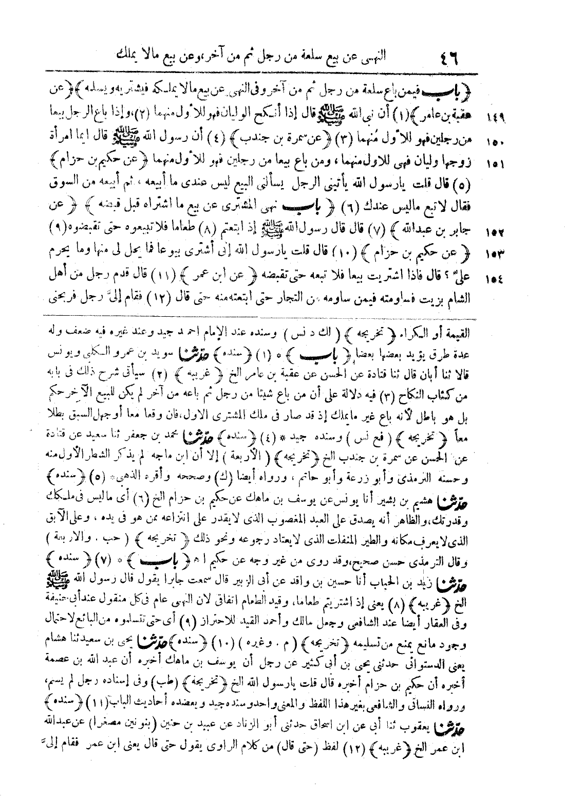 (باب) فيمن باع سلعة من رجل ثم من آخر وفي النهي عن بيع مالا يملكه فيشتريه ويسلمه) (عن عقبة بن عامر) (1) أن نبي الله صلى الله عليه وسلم قال إذا أنكح الوليان فهو للأول منهما (2)، وإذا باع الرجل بينما من رجلين فهو للأول منهما (3) (عن سمرة بن جندب) (4) أن رسول الله صلى الله عليه وسلم قال أيما امرأة زوجها وليان فهي للأول منهما، ومن باع بيعًا من رجلين فهو للأول منهما (عن حكيم بن حزام) (5) قال قلت يا رسول الله يأتيني الرجل يسألني البيع ليس عندي ما أبيعه، ثم أبيعه من السوق فقال لا تبع ما ليس عندك (6) (باب نهي المشتري عن بيع ما اشتراه قبل قبضه) (عن جابر بن عبد الله) (7) قال قال رسول الله صلى الله عليه وسلم إذ ابتعتم (8) طعامًا فلا تبيعوه حتى تقبضوه (9) (عن حكيم بن حزام) (10) قال قلت يا رسول الله إني اشتري بيوعًا فما يحل لي منها وما يحرم علىّ؟ قال اشتريت بيعًا تبعه حتى تقبضه (عن ابن عمر) (11) قال قدم رجل من أهل الشام بزيت فساومته فيمن ساومه من التجار حتى ابتعته منه حتى قال (12) فقام إلى رجل فربحني
