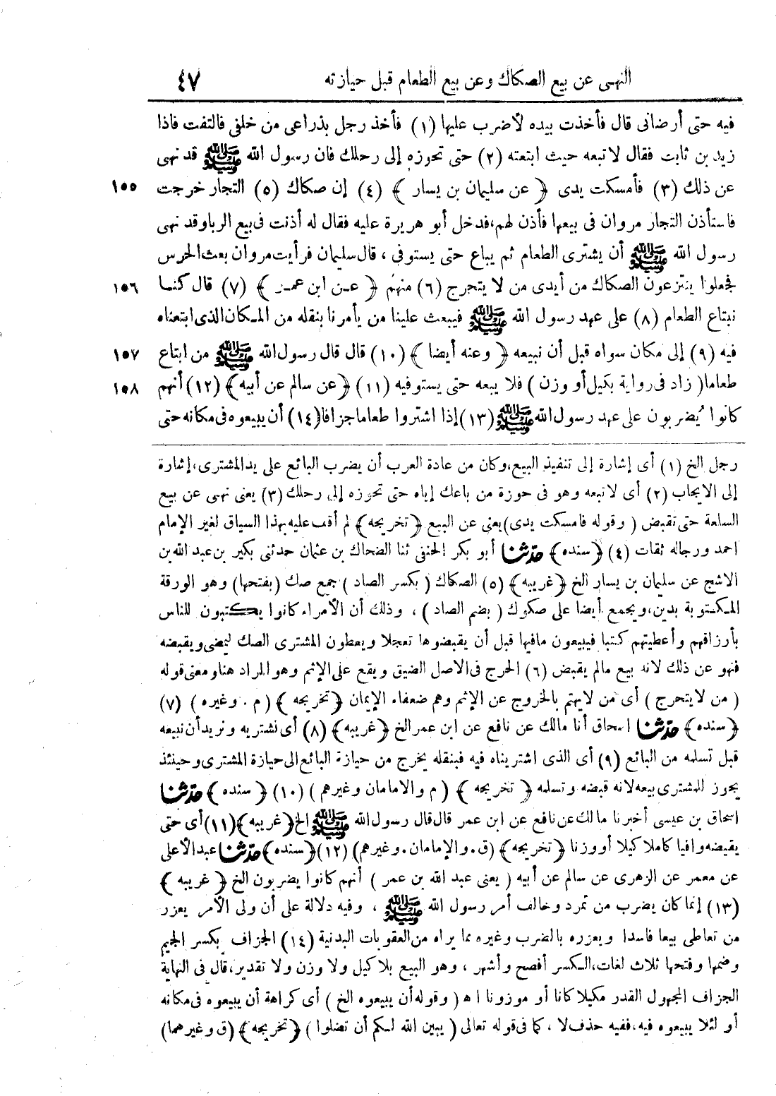 فيه حتى أرضاني قال فأخذت بيده لأضرب عليها (1) فأخذ رجل بذراعي من خلفي فالتفت فإذا زيد بن ثابت فقال لأتبعه حيث ابتعته (2) حتى تحوزه إلى رحلك فإن رسول الله صلى الله عليه وسلم قد نهى عن ذلك (3) فأمسكت يدي (عن سليمان بن يسار) (4) إن صكاك (5) التجار خرجت فاستأذن التجار مروان في بيعها فأذن لهم، فدخل أبو هريرة عليه فقال له أذنت في بيع الربا وقد نهى رسول الله صلى الله عليه وسلم أن يشتري الطعام ثم يباع حتى يستوفى، قال سليمان فرأيت مروان بعث الحرث فجعلوا ينتزعون الصكاك من أيدي من لا يتحرج (6) منهم (عن ابن عمر) (7) قال كنا نبتاع الطعام (8) على عهد رسول الله صلى الله عليه وسلم فيبعث علينا من يأمرنا بنقله من المكان الذي ابتعناه فيه (9) إلى مكان سواه قبل أن نبيعه (وعنه أيضًا) (10) قال قال رسول الله صلى الله عليه وسلم من ابتاع طعامًا (زاد في رواية بكيل أو وزن) فلا يبعه حتى يستوفيه (11) (عن سالم عن أبيه) (12) أنهم كانوا يضربون على عهد رسول الله صلى الله عليه وسلم (13) إذا اشتروا طعامًا جزافا (14) أن يبيعوه في مكانه حتى