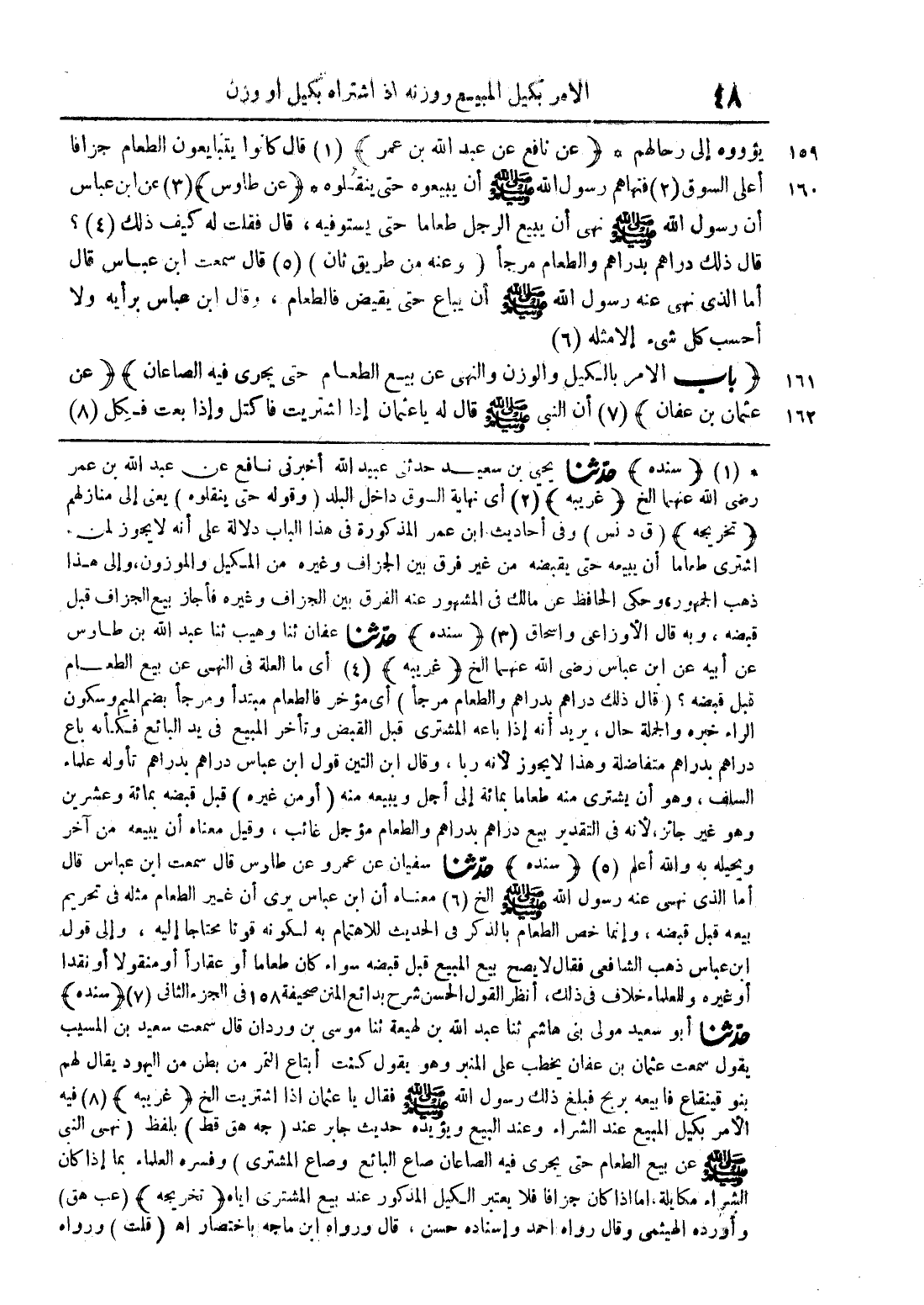 (باب الأمر بالكيل والوزن والنهي عن بيع الطعام حتى يجري فيه الصاعان) (عن عثمان بن عفان) (7) أن النبي صلى الله عليه وسلم قال له يا عثمان إذا اشتريت فاكتل وإذا بعت فكل (8)