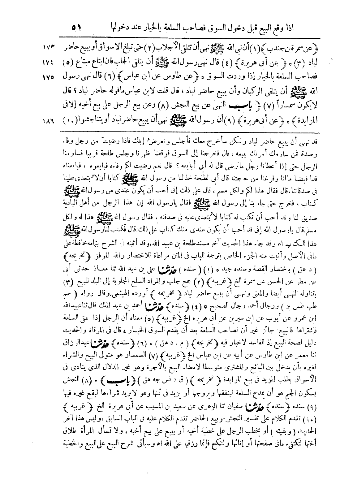 (عن سمرة بن جندب) (1) أن نبي الله صلى الله عليه وسلم نهى أن تتلقى الأجبال (2) حتى تبلغ الأسواق أو يبيع حاضر لباد (3) * (عن أبي هريرة) (4) قال نهى رسول الله صلى الله عليه وسلم أن يتلقى الجلب فإن ابتاع مبتاع (5) فصاحب السلعة بالخيار إذا وردت السوق* (عن طاوس عن ابن عباس) (6) قال نهى رسول الله صلى الله عليه وسلم أن يتلقى الركبان وأن يبيع حاضر لباد، وقال قلت لابن عباس ما قوله حاضر لباد؟ قال لا يكون سمسارًا (7) (باب النهي عن بيع النجش (8) وعن بيع الرجل على بيع أخيه إلا في المزايدة) * (عن أبي هريرة) (9) أن رسول الله صلى الله عليه وسلم نهى أن يبيع حاضر لباد أو يتناجشوا (10)