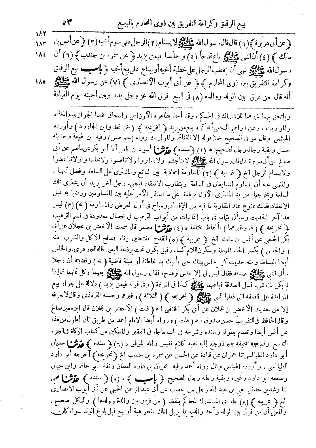 (عن أبي هريرة) (1) قال قال رسول الله صلى الله عليه وسلم لا يستام (2) الرجل على سوم أخيه (3) (عن أنس بن مالك) (4) أن النبي صلى الله عليه وسلم باع قدحًا (5) وحِلسا فيمن يزيد (عن سمرة بن جندب) (6) أن رسول الله صلى الله عليه وسلم نهى أن يخطب الرجل على خطبة أخيه أو يبتاع على بيع أخيه (باب بيع الرقيق وكراهة التفريق بين ذوي المحارم) (عن أبي أيوب الأنصاري) (7) عن رسول الله صلى الله عليه وسلم أنه قال من فرق بين الولد ووالده (8) في البيع فرق الله عز وجل بينه وبين أحبته يوم القيامة