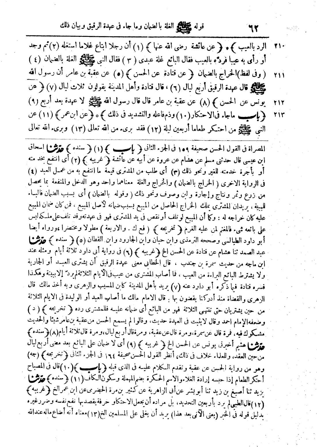 المصراة في القول الحسن صحيفة 159 في الجزء الثاني (باب) (1) (سنده) حدثنا إسحاق ابن عيسى قال حدثني مسلم عن هشام عن عروة عن أبيه عن عائشة (غريبه) (2) أي انتفع بخد منه أو بأجرة خدمته للغير ونحو ذلك (3) أي طلب من المشتري قيمة ما انتفع به من عمل العبد (4) في الرواية الأخرى (الخراج بالضمان) والخراج والغلة معناهما واحد وهو الدخل والمنفعة بما يحصل من زرع وثمر ونتاج وإجارة ولبن وصوف ونحو ذلك (وقوله بالضمان) أي بسبب الضمان فالباء للبينة، يريد أن المشتري يملك الخراج الحاصل من المبيع بسبب ضمانه لأصل المبيع، فمن كان ضمان المبيع عليه كان خراجه له: وكما أن المبيع لو تلف أو نقص في يد المشتري فهو في عهدته وقد تلف على ملكه ليس على بائعه فالمغنم لمن عليه الغرم (تخريجه) (فع ك. والأربعة) مطولًا ومختصرًا، ورواه أيضًا أبو داود الطيالسي وصححه الترمذي وابن حبان وابن الجارود وابن القطان (5) (سنده) حدثنا عبد الصمد ثنا هشام عن قتادة عن الحسن الخ (غريبه) (6) في رواية أبي داود ثلاثة أيام ومثله عند ابن ماجه من حديث سمرة بن جندب، قال الخطابي معنى عهدة الرقيق أن يشتري العبد أو الجارية ولا يشترط البائع البراءة من العيب، فما أصاب المشتري من عيب في الأيام الثلاثة لم يرد إلا ببينة وهكذا فسره قتادة فيما ذكره أبو داود عنه (7) يريد بأهل المدينة كابن المسيب والزهري وبه أخذ مالك قال الزهري والقضاة منذ أدركنا يقضون بها: قال الإمام مالك ما أصاب العبد أو الوليدة في الأيام الثلاثة من حين يشتريان حتى تنتهي الثلاثة فهو البائع أي ضمانه عليه فللمشتري رده (تخريجه) (د) وضعفه الإمام أحمد وقال لا يثبت في العهدة حديث، وقالوا لم يسمع الحسن من عقبة بن عامر شيئًا والحديث مشكوك فيه، فمرة قال عن سمرة، ومرة قال عن عقبة، ومرة قال أربع ليال، ومرة قال ثلاثة أيام (8) (سنده) حدثنا هشيم أخبرني يونس عن الحسن الخ (غريبه) (9) أي لا ضمان على البائع بعد مضي أربع ليال من حين العقد، وللعلماء خلاف في ذلك، انظر القول الحسن صحيفة 164 في الجزء الثاني (تخريجه) (جه) وهو من رواية الحسن عن عقبة وتقدم الكلام عليه في الذي قبله (باب) (10) قال في المصباح أحتكر الطعام إذا حبسه إرادة الغلاء والاسم الحكرة بضم المهملة وسكون الكاف (11) (سنده) حدثنا يزيد ثنا أصبغ بن زيد ثنا أبو بشر عن أبي الزاهرية عن كثير بن مرة الحضرمي عن ابن عمر الخ (غريبه) (12) قال الطيبي لم يرد بأربعين التحديد، بل مراده أن يجعل الاحتكار حرفة يقصد بها نفع نفسه وضرر غيره بدليل قوله في الخبر (يعني الآتي بعد هذا) يريد أن يغلي على المسلمين الخ (13) معناه أنه أضاع ماله عند الله