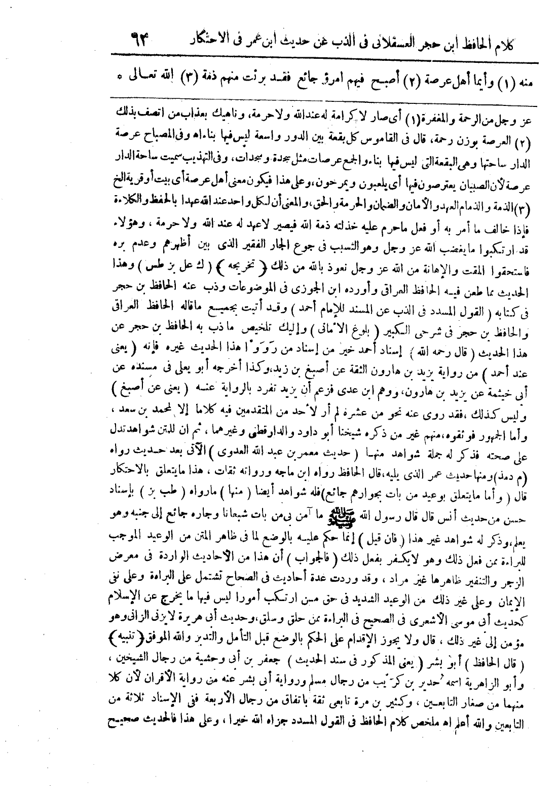 عز وجل من الرحمة والمغفرة (1) أي صار لا كرامة له عند الله ولا حرمة، وناهيك بعذاب من اتصف بذلك (2) العرصة بوزن رحمة، قال في القاموس كل بقعةٍ بين الدور واسعة ليس فيها بناء اهـ وفي المصباح عرصة الدار ساحتها وهي البقعة التي ليس فيها بناء والجمع عرصات مثل سجدة وسجدات، وفي التهذيب سميت ساحة الدار عرصة لأن الصبيان يعترصون فيها أي يلعبون ويمرحون، وعلى هذا فيكون معنى أهل عرصة أي بيت أو قرية الخ (3) الذمة والذمام العهد والأمان والضمان والحرمة والحق، والمعنى أن لكل واحدٍ عند الله عهدًا بالحفظ والكلاءة فإذا خالف ما أمر به أو فعل ما حرم عليه خذلته ذمة الله فيصير لا عهد له عند الله ولا حرمة، وهؤلاء قد ارتكبوا ما يغضب الله عز وجل وهو التسبب في جوع الجار الفقير الذي بين أظهرهم وعدم بره فاستحقوا المقت والإهانة من الله عز وجل نعوذ بالله من ذلك (تخريجه) (ك عل بز طس) وهذا الحديث مما طعن فيه الحافظ العراقي وأورده ابن الجوزي في الموضوعات وذب عنه الحافظ بن حجر في كتابه (القول المسدد في الذب عن المسند للإمام أحمد) وقد أتيت بجميع ما قاله الحافظ العراقي والحافظ بن حجر في شرحي الكبير (بلوغ الأماني) وإليك تلخيص ما ذب به الحافظ بن حجر عن هذا الحديث (قال رحمه الله) إسناد أحمد خير من إسناد من رووا هذا الحديث غيره فإنه (يعني عند أحمد) من رواية يزيد بن هارون الثقة عن أصبغ بن زيد، وكذا أخرجه أبو يعلى في مسنده عن أبي خثيمة عن يزيد بن هارون، ووهم ابن عدي فزعم أن يزيد تفرد بالرواية عنه (يعني عن أصبغ) وليس كذلك، فقد روى عنه نحو من عشرة لم أر لأحدٍ من المتقدمين فيه كلامًاإلا لمحمد بن سعد، وأما الجمهور فوثقوه، منهم غير من ذكره شيخنا أبو داود والدارقطني وغيرهما، ثم ان للمتن شواهد تدل على صحته فذكر له جملة شواهد منها (حديث معمر بن عبد الله العدوي) الآتي بعد حديثٍ رواه (م دمذ) ومنها حديث عمر الذي يليه، قال الحافظ رواه ابن ماجه ورواته ثقات، هذا ما يتعلق بالاحتكار قال (وأما ما يتعلق بوعيد من بات بجوارهم جائع) فله شواهد أيضًا (منها) ما رواه (طب بز) بإسناد حسن من حديث أنسٍ قال قال رسول الله صلى الله عليه وسلم ما آمن بي من بات شبعانًا وجاره جائع إلى جنبه وهو يعلم، وذكر له شواهد غير هذا (فان قيل) إنما حكم عليه بالوضع لما في ظاهر المتن من الوعيد الموجب للبراءة ممن فعل ذلك وهو لا يكفر بفعل ذلك (فالجواب) أن هذا من الأحاديث الواردة في معرض الزجر والتنفير ظاهرها غير مراد، وقد وردت عدة أحاديث في الصحاح تشتمل على البراءة، وعلى نفي الإيمان وعلى غير ذلك من الوعيد الشديد في حق من ارتكب أمورًا ليس فيها ما يخرج عن الإسلام كحديث أبي موسى الأشعري في الصحيح في البراءة ممن حلق وسلق، وحديث أبي هريرة لا يزني الزاني وهو مؤمن إلى غير ذلك، وقال ولا يجوز الإقدام على الحكم بالوضع قبل التأمل والتدبر والله الموفق (تنبيه) (قال الحافظ) أبو بشر (يعني المذكور في سند الحديث) جعفر بن أبي وحشية من رجال الشيخين، وأبو الزاهرية اسمه حدير بن كريب من رجال مسلم ورواية أبي بشر عنه من رواية الأقران لأن كلًا منهما من صغار التابعين، وكثير بن مرة تابعي ثقة باتفاقٍ من رجال الأربعة في الإسناد ثلاثة من التابعين والله أعلم اهـ ملخص كلام الحافظ في القول المسدد جزاه الله خيرًا، وعلى هذا فالحديث صحيح