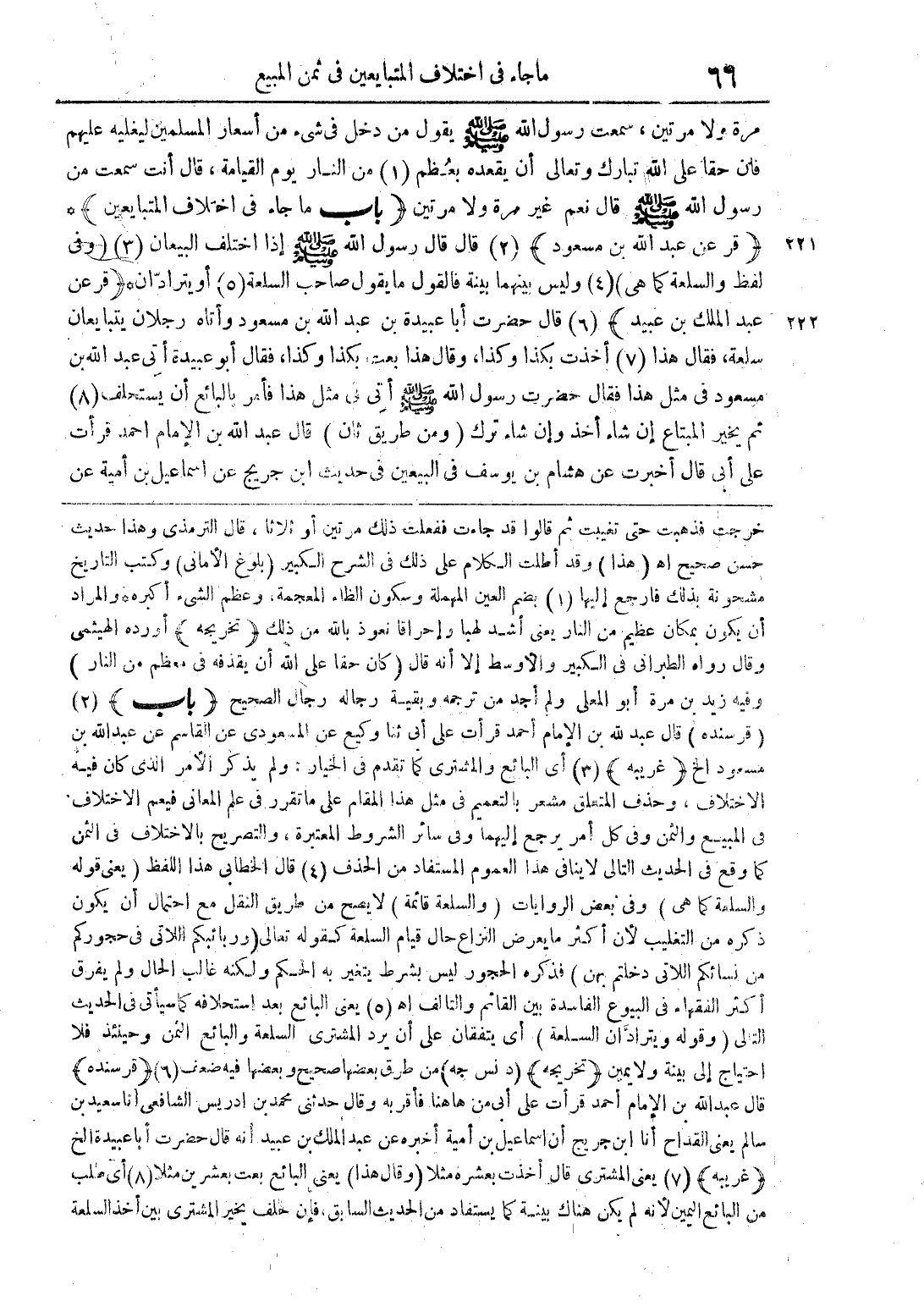 خرجت فذهبت حتى تغيبت ثم قالوا قد جاءت ففعلت ذلك مرتين أو ثلاثًا، قال الترمذي وهذا حديث حسن صحيح اهـ (هذا) وقد أطلت الكلام على ذلك في الشرح الكبير (بلوغ الأماني) وكتب التاريخ مشحونة بذلك فارجع إليها (1) بضم العين المهملة وسكون الظاء المعجمة، وعظم الشيء أكبره والمراد أن يكون بمكانٍ عظيمٍ من النار يعني أشد لهبًا وإحراقًا نعوذ بالله من ذلك (تخريجه) أورده الهيثمي وقال رواه الطبراني في الكبير والأوسط إلا أنه قال (كان حقًا على الله أن يقذفه في معظمٍ من النار) وفي زيد بن مرة أبو المعلي ولم أجد من ترجمه وبقية رجاله رجال الصحيح (باب) (2) (قر سنده) قال عبد الله بن الإمام أحمد قرأت على أبي ثنا وكيع عن المسعودي عن القاسم عن عبيد الله بن مسعود الخ (غريبه) (3) أي البائع والمشتري كما تقدم في الخيار: ولم يذكر الأمر الذي كان فيه الاختلاف، وحذف المتعلق مشعر بالتعميم في مثل هذا المقام على ما تقرر في علم المعاني فيعم الاختلاف في المبيع والثمن وفي كل أمرٍ يرجع إليهما وفي سائر الشروط المعتبرة، والتصريح بالاختلاف في الثمن كما وقع في الحديث التالي لا ينافي هذا العموم المستفاد من الحذف (4) قال الخطابي هذا اللفظ (يعني قوله والسلمة كما هي) وفي بعض الروايات (والسلعة قائمة) لا يصح من طريق النقل مع احتمال أن يكون ذكره من التغليب لأن أكبر ما يعرض من النزاع حال قيام السلعة كقوله تعالى {وربائبكم اللاتي في حجوركم من نسائكم اللاتي دخلتم بهن} فذكره الحجور ليس بشرطٍ يتغير به الحكم ولكنه غالب الحال ولم يفرق أكثر الفقهاء في البيوع الفاسدة بين القائم والتالف اهـ (5) يعني البائع بعد استحلافه كما سيأتي في الحديث التالي (وقوله ويترادان السلعة) أي يتفقان على أن يرد المشتري السلعة والبائع الثمن وحينئذٍ فلا احتجاج إلى بينةٍ ولا يمين (تخريجه) (د ني جه) من طرقٍ بعضها صحيح وبعضها فيه ضعف (6) (قر سنده) قال عبد الله بن الإمام أحمد قرأت على ابي من هاهنا فأقر به وقال حدثني محمد بن ادريس الشافعي أنا سعيد بن سالم يعني القداح أنا ابن جريح أن اسماعيل بن أمية أخبره عن عبد الملك بن عبيد الله انه قال حضرت أبا عبيدة الخ (غريبه) (7) يعني المشتري قال أخذت بعشره مثلًا (وقال هذا) يعني البائع بعت بعشرين مثلًا (8) أي طلب من البائع اليمين لأنه لم يكن هناك بينة كما يستفاد من الحديث فإن حلف يخير المشتري بين أخذ السلعة