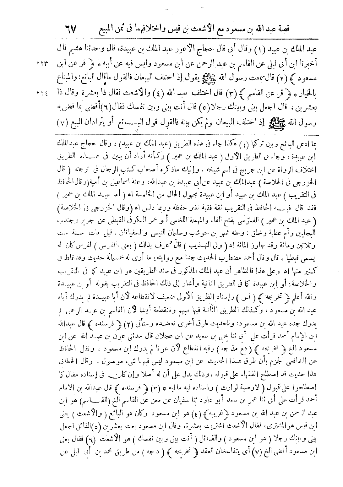 بما ادعى البائع وبين تركها (1) هكذا جاء في هذه الطريق (عبد الملك بن عبيد)، وقال حجاج عبد الملك ابن عبيدة، وجاء في الطريق الأولى (عبد الملك بن عمير) وكأنه أراد أن يبين في هذه الطريق اختلاف الرواة عن ابن جريح في اسم شيخه. وإليك ما ذكره أصحاب كتب الرجال في ترجمته (قال الخزرجي في الخلاصة) عبد الملك بن عبيد عن أبي عبيدة بن عبد الله، وعنه اسماعيل بن أمية (وقال الحافظ في التقريب) عبد الملك بن عبيد أو ابن عبيدة مجهول من الخامسة اهـ (أما عبد الملك بن عمير) فقد قال فيه الحافظ في التقريب ثقة فقيه تغير حفظه وبما دلس اهـ (وقال الخزرجي في الخلاصة) (عبد الملك بن عمير) الفرسي بفتح الفاء والمهملة اللخمي أبو عمر الكوفي القبطي عن جرير وجندب البجليين وأم عطية وخلق: وعنه شهر بن حوشب وسليمان التيمي والسفيانان، قيل مات سنة ست وثلاثين ومائة وقد جاوز المائة اهـ (وفي التهذيب) قال عرف بذلك (يعني بالفرسي) لفرسٍ كان له يسمى قبطيًا، قال وقال أحمد مضطرب الحديث جدًا مع روايته: ما أرى له خمسمائة حديث وقد غلط في كثيرٍ منها اهـ وعلى هذا فالظاهر أن عبد الملك المذكور في سند الطريقين هو ابن عبيد كما في التقريب والخلاصة: أو ابن عبيدة كما في الطريق الثانية وأشار إلى ذلك الحافظ في التقريب بقوله أو بن عبيدة والله أعلم (تخريجه) (نس) وإسناد الطريق الأولى ضعيف لانقطاعه لأن أبا عبيدة لم يدرك أباه عبد الله بن مسعود، وكذلك الطريق الثانية فيها مبهم ومنقطعة أيضًا لأن القاسم بن عبد الرحمن لم يدرك جده عبد الله بن مسعود: وللحديث طرق أخرى تعضده وستأتي (2) (قر سنده) قال عبد الله ابن الإمام أحمد قرأت على ابي ثنا يحيى بن سعيد عن ابن عجلان قال حدثني عون بن عبيد الله عن ابن مسعودٍ الخ (تخريجه) (فع مذ جه) وفيه انقطاع ابن عجلان قال حدثني عون بن عبيد الله عن ابن مسعود، ونقل الحافظ عن الشافعي الجزم بأن طرق هذا الحديث عن ابن مسعود ليس فيها شيء موصول، وقال الخطابي هذا حديث قد اصطلح الفقهاء على قبوله، وذلك يدل على أن له أصلًا وإن كان في إسناده مقال كما اصطلحوا على قبول (لا وصية لوارث) واسناده فيه ما فيه (3) (قر سنده) قال عبد الله بن الامام أحمد قرأت على ابي ثنا عمر بن سعد أبو داود ثنا سفيان عن معن عن القاسم الخ (القاسم) هو ابن عبد الرحمن بن عبد الله بن مسعود (غريبه) (4) هو ابن مسعود وكان هو البائع (والأشعث) يعني ابن قيس هو المشتري، فقال الأشعث اشتريت بعشرة، وقال ابن مسعود بعت بعشرين (5) القائل اجعل بيني وبينك رجلًا (هو ابن مسعود) والقائل (أنت بيني وبين نفسك) هو الأشعث (6) فقال يعني ابن مسعود أقضي الخ (7) أي: يتفاسخان العقد (تخريجه) (د جه) من طريق محمد بن أبي ليلى عن