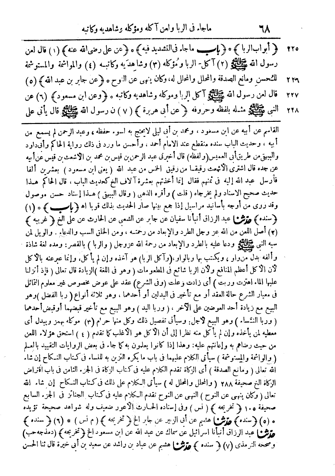 (أبواب الربا) * (باب ما جاء في التشديد فيه) * (عن علي رضي الله عنه) (1) قال لعن رسول الله صلى الله عليه وسلم (2) آكل الربا ومؤكله (3) وشاهديه وكاتبه (4) والمواشمة والمستوشمة للحسن ومانع الصدقة والمحلل والمحلل له، وكان ينهى عن النوح * (عن جابر بن عبد الله) (5) قال لعن رسول الله صلى الله عليه وسلم آكل الربا وموكله وشاهديه وكاتبه * (وعن ابن مسعود) (6) عن النبي صلى الله عليه وسلم مثله بلفظه وحروفه (عن أبي هريرة) (7) ن رسول الله صلى الله عليه وسلم قال يأتي على