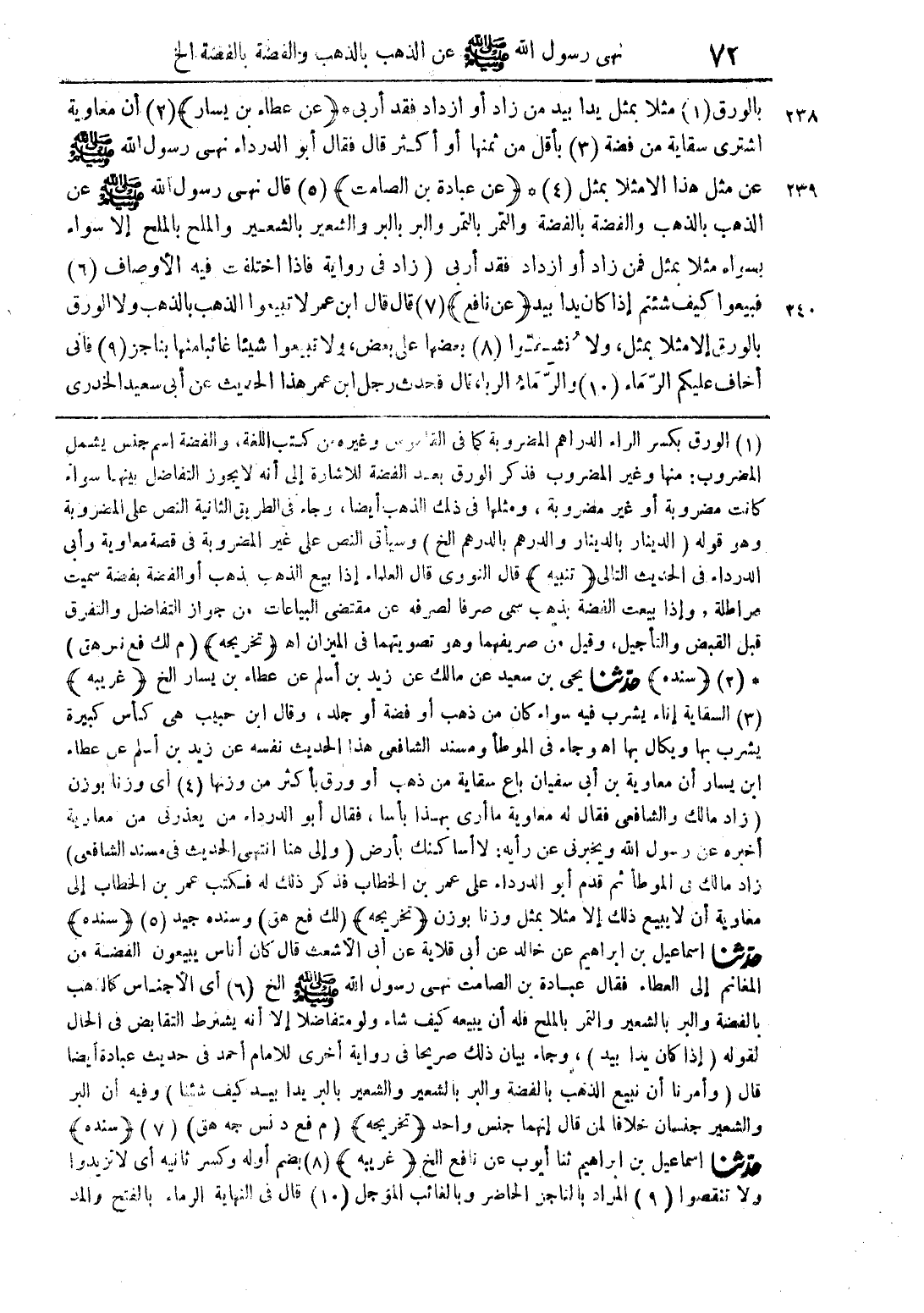 بالورق (1) مثلًا بمثل يدًا بيد من زاد أو ازداد فقد أربى (عن عطاء بن يسار) (2) أن معاوية اشترى سقاية من فضة (3) بأقل من ثمنها أو أكثر قال فقال أبو الدرداء نهى رسول الله صلى الله عليه وسلم عن مثل هذا الامثلا بمثل (4) (عن عبادة بن الصامت) (5) قال نهى رسول الله صلى الله عليه وسلم عن الذهب بالذهب والفضة بالفضة والتمر بالتمر والبر بالبر والشعير بالشعير والملح بالملح إلا سواء بسواء مثلًا بمثل فمن زاد أو ازداد فقد أربى (زاد في رواية فإذا اختلفت فيه الأوصاف (6) فبيعوا كيف شئتم إذا كان يدًا بيد (عن نافع) (7) قال قال ابن عمر لا تبيعوا الذهب بالذهب ولا الورق بالورق إلا مثلًا بمثل، ولا نشفوا (8) بعضها على بعض، ولا تبيعوا شيئًا غائبًا منها بناجز (9) فإني عليكم الرماء (10) والرماء الربا، قال فحدث رجل ابن عمر هذا الحديث عن أبي سعيد الخدري
