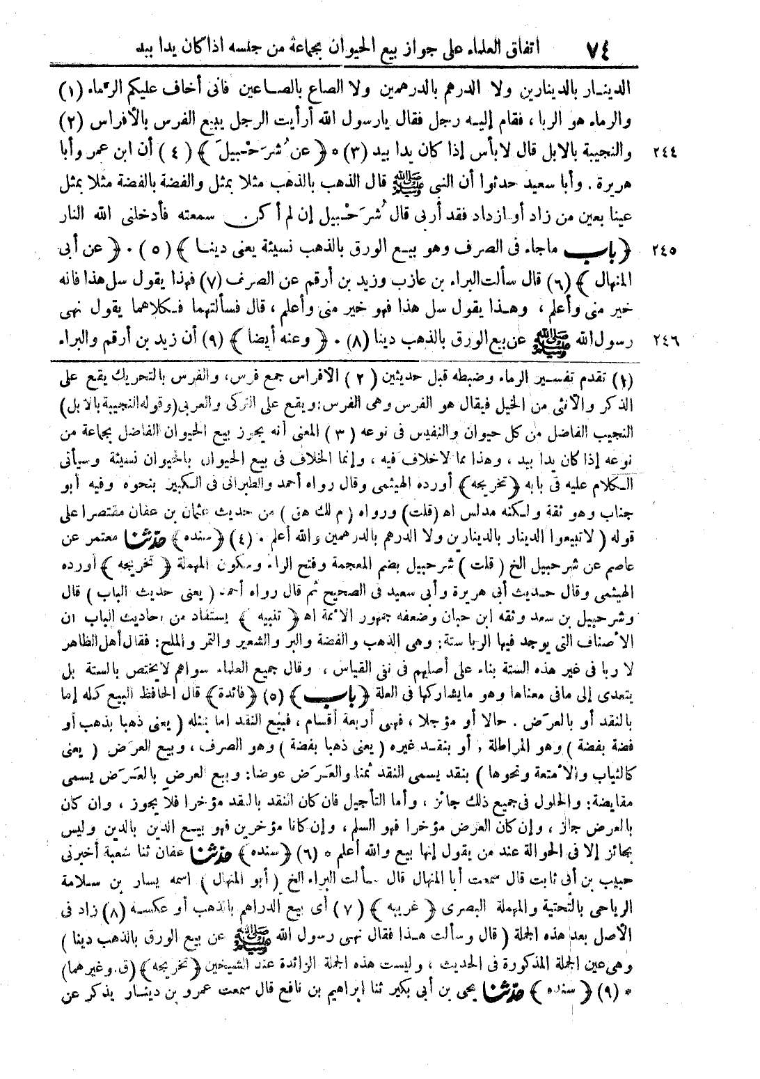 (1) تقدم تفسير الرماء وضبطه قبل حديثين (2) الأفراس جمع فرس، والفرس بالتحريك يقع على الذكر والأنثى من الخيل فيقال هو الفرس وهي الفرس: ويقع على التركي والعربي (وقوله النجيبة بالإبل) النجيب الفاضل من كل حيوان والنفيس في نوعه (3) المعنى إنه يجوز بيع الحيوان الفاضل بجماعة من نوعه إذا كان يدًا بيد، وهذا مما لا خلاف فيه، وإنما الخلاف في بيع الحيوان بالحيوان نسيئة وسيأتي الكلام عليه في بابه (تخريجه) أورده الهيثمي وقال رواه أحمد والطبراني في الكبير بنحوه وفيه أبو جناب وهو ثقة ولكنه مدلس اهـ (قلت) ورواه (م لك هق) من حديث عثمان بن عفان مقتصرًا على قوله (لا تبيعوا الدينار بالدينارين ولا الدرهم بالدرهمين والله أعلم. (4) (سنده) حدثنا معمر عن عاصم عن شرحبيل الخ (قلت) شرحبيل بضم المعجمة وفتح الراء وسكون المهملة (تخريجه) أورده الهيثمي وقال حديث أبي هريرة وأبي سعيد في الصحيح ثم قال رواه أحمد (يعني حديث الباب) قال وشرحبيل بن سعد وثقه ابن حبان وضعفه جمهور الأئمة اهـ (تنبيه) يستفاد من أحاديث الباب إن الأصناف التي يوجد فيها الربا ستة: وهي الذهب والفضة والبر والشعير والتمر والملح: فقال أهل الظاهر لا ربا في غير هذه الستة بناء على أصلهم في نفي القياس، وقال جميع العلماء سواهم لا يختص بالستة بل يتعدى إلى ما في معناها وهو ما يشاركها في العلة (باب) (5) (فائدة) قال الحافظ البيع كله إما بالنقد أو بالعرض. حالًا أو مؤجلًا، فهي أربعة أقسام، فبيع النقد إما بمثله (يعني ذهبًا بذهب أو فضة بفضة) وهو المراطلة، أو بنقد غيره (يعني ذهبًا بفضة) وهو الصرف، وبيع العرض (يعني كالثياب والأمتعة ونحوها) بنقد يسمى النقد ثمنًا والعرض عوضًا: وبيع العرض بالعرض يسمى مقايضة: والحلو في جميع ذلك جائز، وأما التأجيل فإن كان النقد بالنقد مؤخرًا فلا يجوز، وإن كان بالعرض جاز، وإن كان العرض مؤخرًا فهو السلم، وإن كانا مؤخرين فهو بيع الدين بالدين وليس بجائز إلا في الحوالة عند من يقول إنها بيع والله أعلم (6) (سنده) حدثنا عفان ثنا شعبة أخبرني حبيب بن أبي ثابت قال سمعت أبا المنهال قال سألت البراء الخ (أبو المنهال) اسمه يسار بن سلامة الرياحي بالتحتية والمهملة البصري (غريبه) (7) أي بيع الدراهم بالذهب أو عكسه (8) زاد في الأصل بعد هذه الجملة (قال وسألت هذا فقال نهى رسول الله صلى الله عليه وسلم عن بيع الورق بالذهب دينًا) وهي عين الجملة المذكورة في الحديث، وليست هذه الجملة الزائدة عند الشيخين (تخريجه) (ق. وغيرهما) (9) (سنده) حدثنا يحيى بن أبي بكير ثنا إبراهيم بن نافع قال سمعت عمرو بن دينار يذكر عن