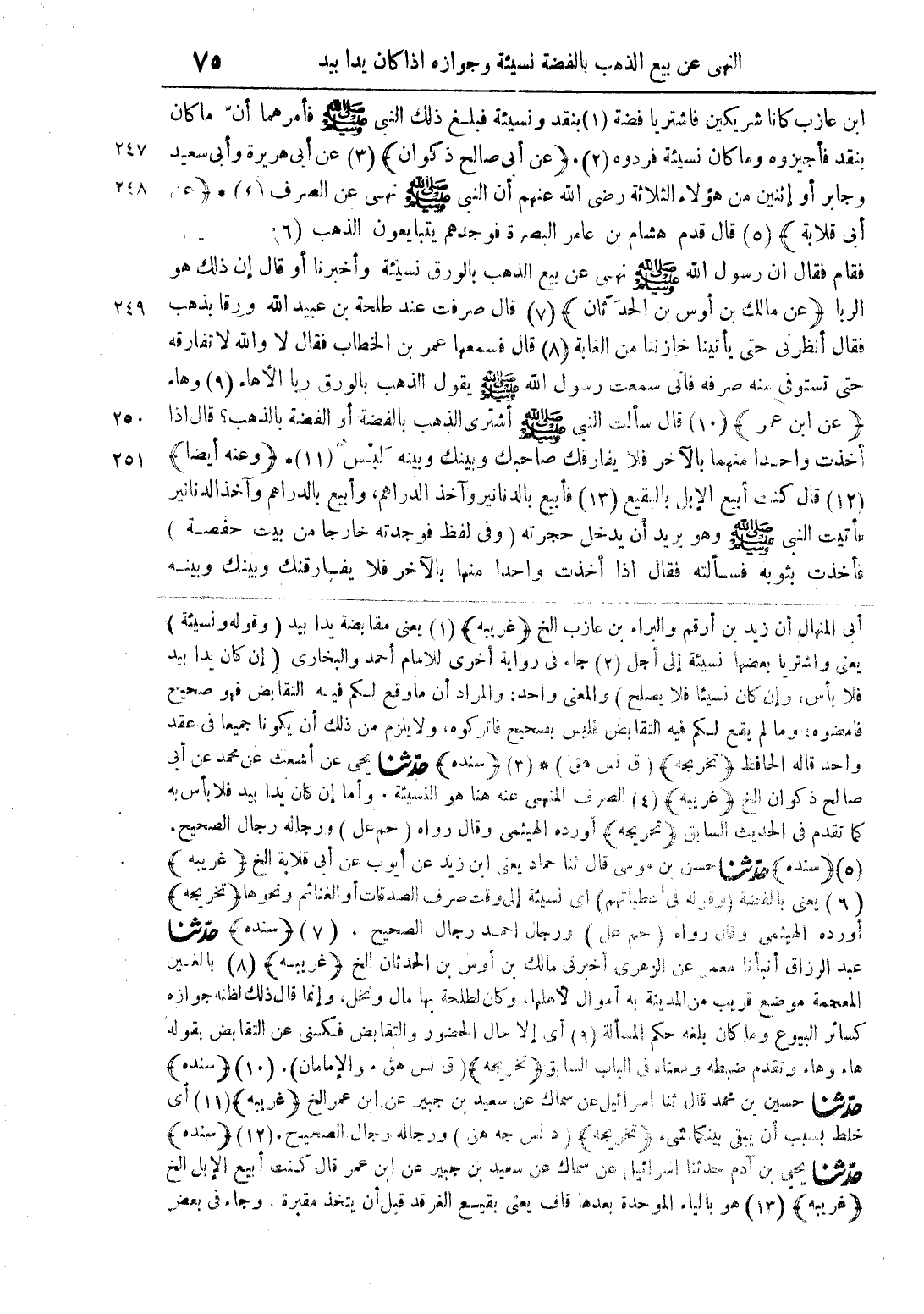 ابن عازب كانا شريكين فاشتريا فضة (1) بنقد ونسيئة فبلغ ذلك النبي صلى الله عليه وسلم فأمرهما أن ما كان بنقد فأجيزوه وما كان نسيئة فردوه (2). (عن أبي صالح ذكوان) (3) عن أبي هريرة وأبي سعيد وجابر أو اثنين من هؤلاء الثلاثة رضي الله عنهم أن النبي صلى الله عليه وسلم نهى عن الصرف (4) (عن أبي قلابة) (5) قال قدم هشام بن عامر البصرة فوجدهم يتبايعون الذهب (6) $$$ فقام فقال أن رسول الله صلى الله عليه وسلم نهى عن بيع الذهب بالورق نسيئة وأخبرنا أو قال إن ذلك هو الربا (عن مالك بن أوس بن الحدث ثان) (7) قال صرفت عند طلحة بن عبيد الله ورقا بذهب فقال أنظرني حتى يأتينا $$$ من الغابة (8) قال فسمعها عمر بن الخطاب فقال لا والله لا تفارقه حتى تستوفى منه صرفه فإني سمعت رسول الله صلى الله عليه وسلم يقول الذهب بالورق ربا الأهاء (9) وهاء (عن ابن عمر) (10) قال سألت النبي صلى الله عليه وسلم اشترى الذهب بالفضة أو الفضة بالذهب؟ قال إذا أخذت واحدًا منهما بالآخر فلا يفارقك صاحبك وبينك وبينه لبس (11) (وعنه أيضًا) (12) قال كنت أبيع الإبل بالبقيع (13) فأبيع بالدنانير وآخذ الدراهم، وأبيع بالدراهم وآخذ الدنانير أتيت النبي صلى الله عليه وسلم وهو يريد أن يدخل حجرته (وفي لفظ فوجدته خارجًا من بيت حفصة) فأخذت بثوبه فسألته فقال إذا أخذت واحدًا منها بالآخر فلا يفارقنك وبينك وبينه
