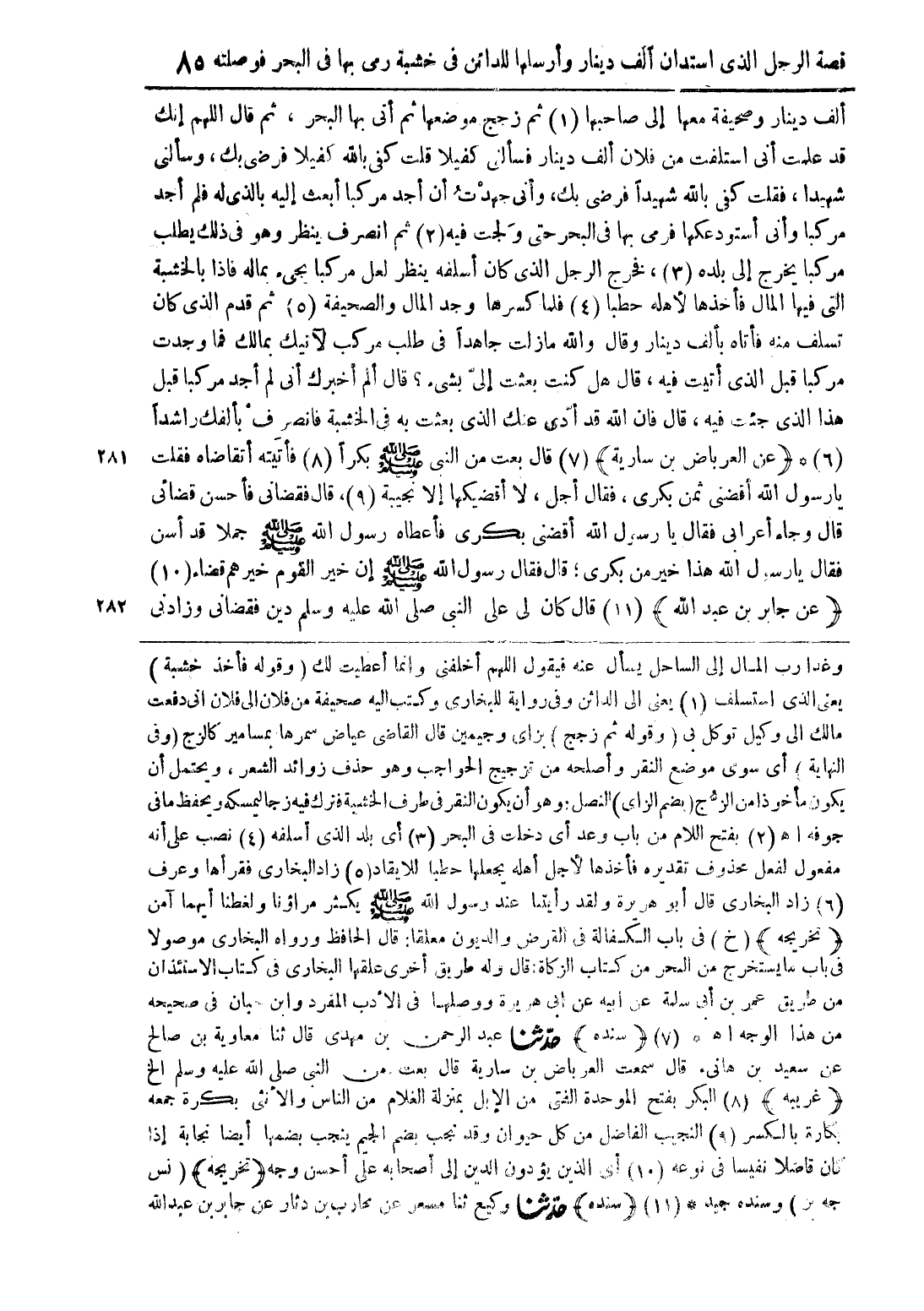 ألف دينار وصحيفة معها إلى صاحبها (1) ثم زجج موضعها ثم أتى بها البحر، ثم قال اللهم أنك قد علمت أني استلفت من فلان ألف دينار فسألني كفيلاً قلت كفى بالله كفيلا فرضى بك، وسألني شهيدا، فقلت كفى بالله شهيدًا فرضى بك، وأنى جهدت أن أجد مركبا أبعث إليه بالذي له فلم أجد مركبا وأنى أستودعكها فرمى بها في البحر حتى ولجت فيه (2) ثم انصرف ينظر وهو في ذلك يطلب مركبا يخرج إلى بلده (3)، فخرج الرجل الذي كان أسلفه ينظر لعل مركبا يجيء بماله فإذا بالخشبة التي فيها المال فأخذها لأهله حطبا (4) فلما كسرها وجد المال والصحيفة (5) ثم قدم الذي كان تسلف منه فأتاه بألف دينار وقال والله ما زلت جاهدًا في طلب مركب لآتيك بمالك فما وجدت مركبا قبل الذي أتيت فيه، قال هل كنت بعثت إلى بشيء؟ قال ألم أخبرك أني لم أجد مركبا قبل هذا الذي جئت فيه، قال فإن الله قد أدى عنك الذي بعثت به في الخشية فانصرف ف بألفك راشدًا (6) * (عن العرباض بن سارية) (7) قال بعت من النبي صلى الله عليه وسلم بكراً (8) فأتيته أتقاضاه فقلت 281 يا رسول الله أفضى ثمن بكري، فقال أجل، لا أقضيكها إلا نجيبة (9)، قال فقضاني فأحسن قضائي قال وجاء أعرابي فقال يا رسول الله أقضنى بكرى فأعطاه رسول الله صلى الله عليه وسلم جملا قد أسن فقال يا رسول الله هذا خير من بكري؛ قال فقال رسول الله صلى الله عليه وسلم إن خير القوم خيرهم قضاء (10) (عن جابر بن عبد الله) (11) قال كان لي على النبي صلى الله عليه وسلم دين فقضاني وزادني 282
