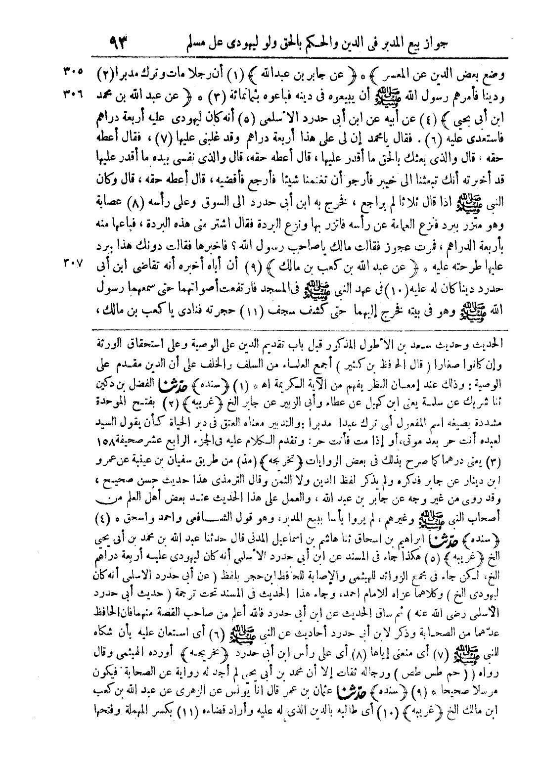 الحديث وحديث سعد بن الأطول المذكور قبل باب تقديم الدين على الوصية وعلى استحقاق الورثة وإن كانوا صغارا (قال الحافظ بن كثير) أجمع العلماء من السلف والخلف على أن الدين مقدم على الوصية: وذلك عند إمعان النظر يفهم من الآية الكريمة أهـ * (1) (سنده) حدثنا الفضل بن دكين ثنا شريك عن سلمة يعني ابن كهيل عن عطاء وأبي الزبير عن جابر الخ (غريبه) (2) بفتح الموحدة مشددة بصيغه اسم المفعول أي ترك عبدا مدبرا: والتدبير معناه العتق في دبر الحياة كأن يقول السيد لعبده أنت حر بعد موتى، أو إذا مت فأنت حر: وتقدم الكلام عليه في الجزء الرابع عشر صحيفة 158 (3) يعني درهما كما صرح بذلك في بعض الروايات (تخريجه) (مذ) من طريق سفيان بن عينية عن عمرو ابن دينار عن جابر فذكره ولم يذكر لفظ الدين ولا الثمن وقال الترمذي هذا حديث حسن صحيح، وقد روى من غير وجه عن جابر بن عبد الله، والعمل على هذا الحديث عند بعض أهل العلم من أصحاب النبي صلى الله عليه وسلم وغيرهم، لم يروا بأسا ببيع المدبر، وهو قول الشافعي وأحمد واسحق * (4) (سنده) حدثنا إبراهيم بن إسحاق ثنا هاشم بن إسماعيل المدني قال حدثنا عبد الله بن محمد بن أبي يحيي الخ (غريبه) (5) هكذا جاء في المسند عن ابن أبي حدرد الأسلمي أنه كان ليهودي عليه أربعة دراهم الخ، لكن جاء في مجمع الزوائد للهيثمي والإصابة للحافظ ابن حجر بلفظ (عن أبي حدرد الأسلمي أنه كان ليهودي الخ) وكلاهما عزاه للأمام أحمد، وجاء هذا الحديث في المسند تحت ترجمة (حديث أبي حدرد الأسلمي رضي الله عنه) ثم ساق الحديث عن ابن أبي حدرد فالله أعلم من صاحب القصة منهما فإن الحافظ عدهما من الصحابة وذكر لابن أبي حدرد أحاديث عن النبي صلى الله عليه وسلم (6) أي استعان عليه بأن شكاه للنبي صلى الله عليه وسلم (7) أي منعني إياها (8) أي على رأس ابن أبي حدرد (تخريجه) أورده الهيثمي وقال رواه ((حم طس طص) ورجاله ثقات إلا أن محمد بن أبي يحي لم أجد له رواية عن الصحابة فيكون مرسلا صحيحا * (9) (سنده) حدثنا عثمان بن عمر قال أنا يونس عن الزهري عن عبد الله بن كعب ابن مالك الخ (غريبه) (10) أي طالبه بالدين الذي له عليه وأراد قضاءه (11) بكسر المهملة وفتحها
