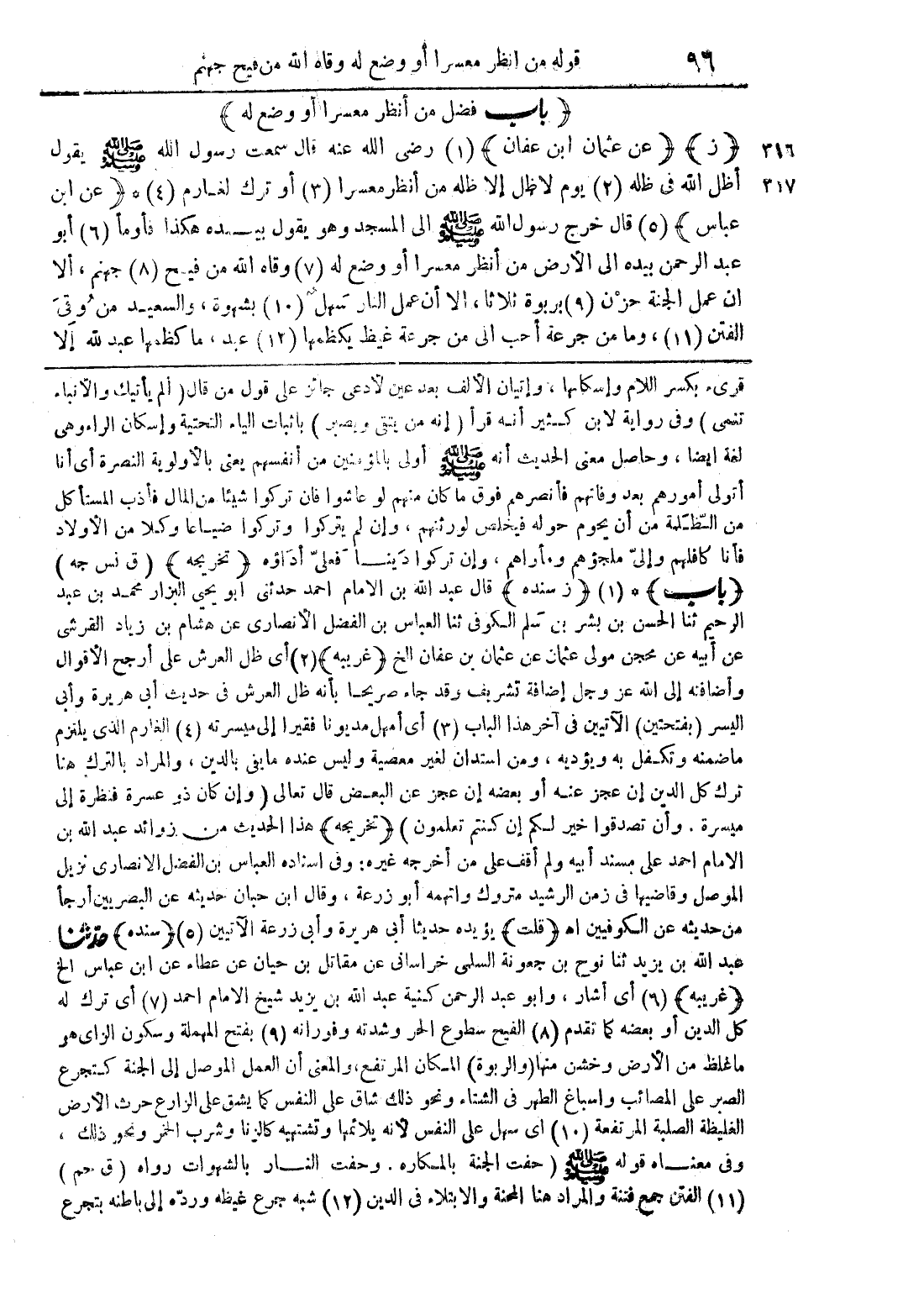 316 (ز) (عن عثمان ابن عفان) (1) رضي الله عنه قال سمعت رسول الله صلى الله عليه وسلم يقول 317 أظل الله في ظله (2) يوم لا ظل إلا ظله من أنظر معسرا (3) أو ترك لغارم (4) * (عن ابن عباس) (5) قال خرج رسول الله صلى الله عليه وسلم إلى المسجد وهو يقول بيده هكذا فأوما (6) أبو عبد الرحمن بيده إلى الأرض من أنظر معسرا أو وضع له (7) وقاه الله من قيح (8) جهنم، ألا أن عمل الجنة حزن (9) بربوة ثلاثا، إلا أن عمل النار سهل (10) بشهوة، والسعيد من وقي الفتن (11)، وما من جرعة أحب إلى من جرعة غيظ يكظمها (12) عبد، ما كظمها عبد لله إلا