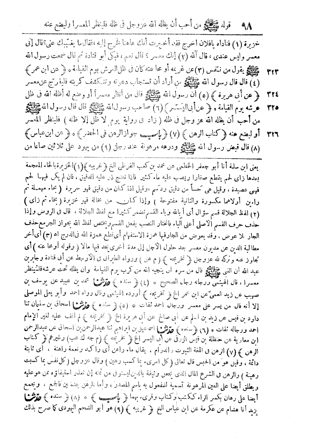 خزيرة (1) فناداه يا فلان أخرج فقد أخبرت أنك هاهنا فخرج إليه، فقال ما يغيبك عني؟ قال إني معسر وليس عندي، قال آلله (2) إنك معسر؟ قال نعم، فبكى أبو قتادة ثم قال سمعت رسول الله 323 صلى الله عليه وسلم يقول من نفس (3) عن غريمه أو محا عنه كان في ظل العرش يوم القيامة * (عن ابن عمر) (4) قال قال رسول الله صلى الله عليه وسلم من أراد أن تستجاب دعوته وتنكشف كربته فليفرج عن معسر 324 (عن أبي هريرة) (5) أن رسول الله صلى الله عليه وسلم قال من أنظر معسراً أو وضع له أظله الله في ظل 325 عرشه يوم القيامة* (عن أبي اليسر) (6) صاحب رسول الله صلى الله عليه وسلم قال قال رسول الله صلى الله عليه وسلم من أحب أن يظله الله عز وجل في ظله (زاد في رواية يوم لا ظل إلا ظله) فلينظر المعسر 326 أو ليضع عنه (كتاب الرهن) (7) (باب جواز الرهن في الحضر) * (عن ابن عباس) (8) قال قبض رسول الله صلى الله عليه وسلم ودرعه مرهونة عند رجل (9) عن يهود على ثلاثين صاعا من