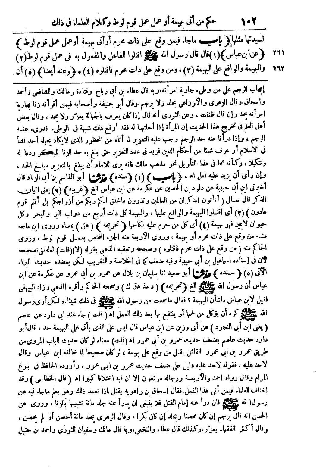 إيجاب الرجم على من وطئ جارية امرأته، وبه قال عطاء بن أبى رباح وقتادة ومالك والشافعى وأحمد واسحاق، وقال الزهرى والأوزاعى يجلد ولا يرجم، وقال أبو حنيفة وأصحابه فيمن أقر أنه زنا بجارية امرأته يحد وإن قال ظننت، وعن الثورى أنه قال إذا كان يعرف بالجهالة يعزّر ولا يحد، وقال بعض أهل العلم فى تخريج هذا الحديث إن المرأة إذا أحلتها له فقد أوقع ذلك شبهة فى الوطئ فدرئ عنه الرجم، وإذا درأنا عنه حد الرجم وجب عليه التعزير لما أتاه من المحظور الذى لا يكاد يجهله أحد نشأ فى الاسلام أو عرف شيئا من أحكام الدين فزيد فى عدد التعزير حتى بلغ به حد الزنا للبكر ردعا له وتنكيلا، وكأنه نحا فى هذا التأويل نحو مذهب مالك فانه يرى للامام أن يبلغ بالتعزير مبلغ الحد، وإن رأى أن يزيد عليه فعل اهـ. (باب) (1) (سنده) حدّثنا أبو القاسم بن أبى الزناد قال أخبرنى ابن أبى حبيبة عن داود بن الحصين عن عكرمة عن ابن عباس الخ (غريبه) (3) يعنى اتيان الذكر قال تعالى {أتأتون الذكران من العالمين وتذرون ما خلق لكم ربكم من أزواجكم بل أنتم قوم عادون} (3) أى اقتلوا البهيمة والواقع عليها، والبهيمة كل ذات أربع من دواب البر والبحر وكل حيوان لا يميز فهو بهيمة (4) أى كل من حرم عليه نكاحها (تخريجه) (هق) بمعناه وروى ابن ماجه منه من وقع على ذات محرم أو بهيمة، وروى الأربعة منه الجزء المختص بعمل قوم لوط، وروى الحاكم منه (من وقع على ذات محرم فاقتلوه) وصححه وتعقبه الذهبى بقوله (لا) (قلت) لعله نفى تصحيحه لأن فى إسناده اسماعيل بن أبى حبيبة وفيه ضعف كما فى الخلاصة والتقريب لكن يعضده حديث البراء الآتى (5) (سنده) حدّثنا أبو سعيد ثنا سليمان بن بلال عن عمرو بن أبى عمرو عن عكرمة عن ابن عباس أن رسول الله صلى الله عليه وسلم الخ (تخريجه) (د مذ هق ك) وصححه الحاكم وأقره الذهبى وزاد البيهقى فقيل لابن عباس ما شأن البهيمة؟ فقال ما سمعت من رسول الله صلى الله عليه وسلم فى ذلك شيئا، ولكن أرى رسول الله صلى الله عليه وسلم كره أن يؤكل من لحمها أو ينتفع بها بعد ذلك العمل اهـ (قلت) جاء عند ابى داود عن عاصم (يعنى ابن أبى النجود) عن أبى رزين عن ابن عباس قال ليس على الذى يأتى على البهيمة حد، قال أبو داود حديث عاصم يضعف حديث عمرو بن أبى عمرو اهـ (قلت) معناه لو كان حديث الباب المروى من طريق عمرو بن ابى عمرو القائل بقتل من وقع على بهيمة، لو كان صحيحا لما خالفه ابن عباس وقال لا حد عليه، فقوله لا حد عليه دليل على ضعف حديث عمرو بن ابى عمرو، وأورده الحافظ فى بلوغ المرام وقال رواه احمد والأربعة ورجاله موثقون إلا ان فيه اختلافا كبيرا اهـ (قال الخطابى) وقد اختلف العلماء فيمن أتى هذا الفعل، فقال اسحاق بن راهويه يقتل اذا تعمد ذلك وهو يعلم ما جاء فيه عن رسول الله صلى الله عليه وسلم فان درأ عنه إمام القتل فلا ينبغى ان يدرأ عنه جلد مائة تشبيها بالزنا، وروى عن الحسن انه قال يرجم إن كان محصنا ويجلد إن كان بكرا، وقال الزهرى يجلد مائة أحصن أو لم يحصن، وقال أكثر الفقهاء يعزّر، وكذلك قال عطاء والنخعى، وبه قال مالك وسفيان الثوري وأحمد بن حنبل