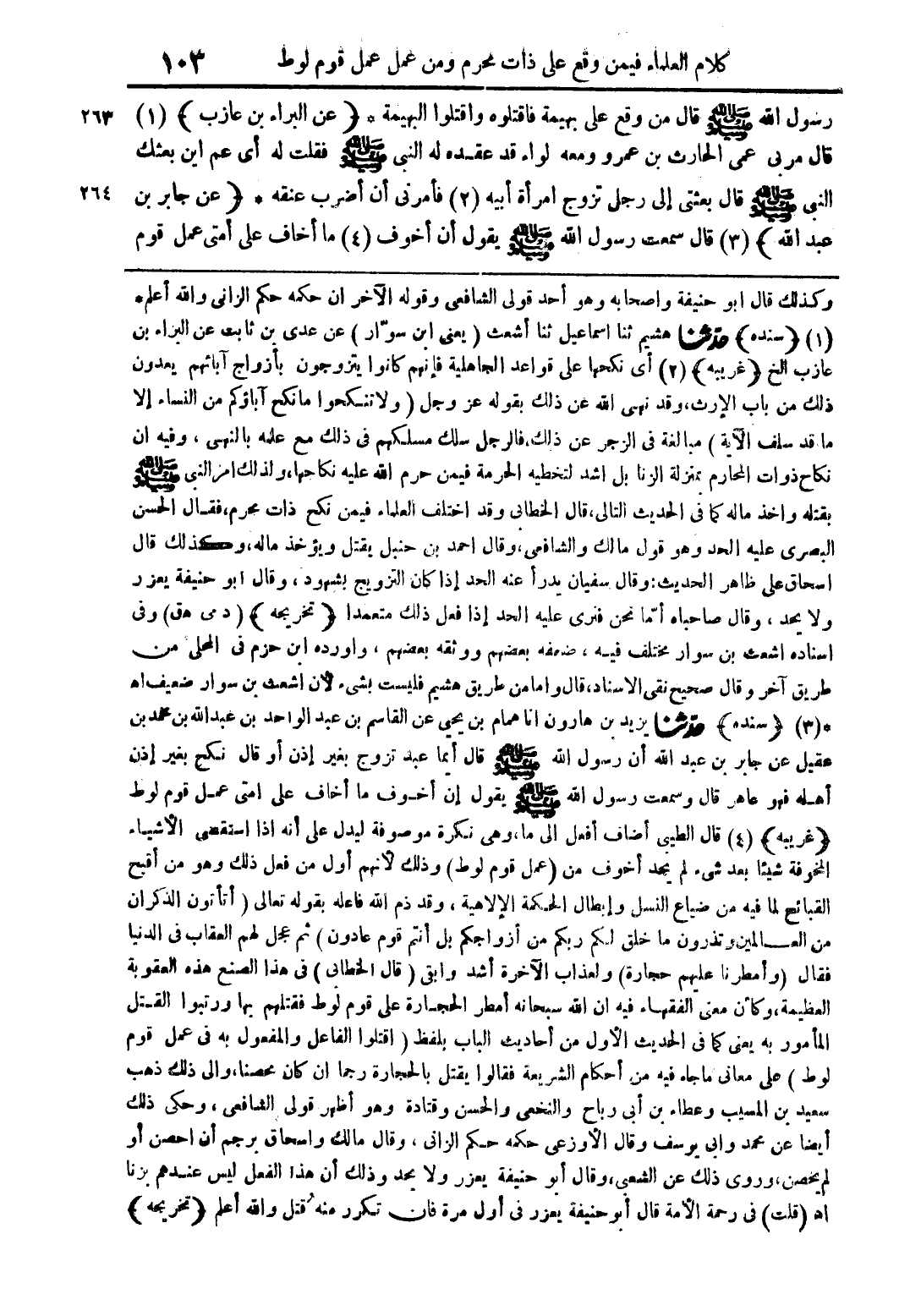 وكذلك قال ابو حنيفة واصحابه وهو أحد قولى الشافعى وقوله الآخر ان حكمه حكم الزانى والله أعلم * (1) (سنده) حدّثنا هشيم ثنا اسماعيل ثنا أشعث (يعنى ابن سوّار) عن عدى بن ثابت عن البراء بن عازب الخ (غريبه) (2) أى نكحها على قواعد الجاهلية فإنهم كانوا يتزوجون بأزواج آبائهم يعدون ذلك من باب الإرث، وقد نهى الله عن ذلك بقوله عز وجل {ولا تنكحوا ما نكح آباؤكم من النساء إلا ما قد سلف الآية} مبالغة فى الزجر عن ذلك، فالرجل سلك مسلكهم فى ذلك مع علمه بالنهى، وفيه ان نكاح ذوات المحارم بمنزلة الزنا بل اشد لتخطيه الحرمة فيمن حرم الله نكاحها، ولذلك امر النبى صلى الله عليه وسلم بقتله واخذ ماله كما فى الحديث التالى، قال الخطابى وقد اختلف العلماء فيمن نكح ذات محرم، فقال الحسن البصرى عليه الحد وهو قول مالك والشافعى، وقال احمد بن حنبل يقتل ويؤخذ ماله، وكذلك قال اسحاق على ظاهر الحديث: وقال سفيان يدرأ عنه الحد إذا كان التزويج بشهود، وقال ابو حنيفة يعزر ولا يحد، وقال صاحباه أمّا نحن فنرى عليه الحد إذا فعل ذلك متعمدا (تخريجه) (د مى هق) وفى اسناده اشعث بن سوار مختلف فيه، ضعفه بعضهم ووثقه بعضهم، واورده ابن حزم فى المحلى من طريق آخر وقال صحيح نقى الاسناد، قال واما من طريق هشيم فليست بشئ لأن اشعث بن سوار ضعيف اهـ * (3) (سنده) حدّثنا يزيد بن هارون انا همام بن يحيى عن القاسم بن عبد الواحد بن عبد الله بن محمد بن عقيل عن جابر بن عبد الله أن رسول الله صلى الله عليه وسلم قال أيما عبد تزوج بغير إذن أو قال نكح بغير إذن أهله فهو عاهر قال وسمعت رسول الله صلى الله عليه وسلم يقول إن أخوف ما أخاف على امتى عمل قوم لوط (غريبه) (4) قال الطيبى أضاف أفعل الى ما، وهى نكرة موصوفة ليدل على أنه اذا استقصى الأشياء المخوفة شيئا بعد شئ لم يحد أخوف من (عمل قوم لوط) وذلك لأنهم أول من فعل ذلك وهو من أقبح القبائح لما فيه من ضياع النسل وإبطال الحكمة الإلاهية، وقد ذم الله فاعله بقوله تعالى {أتأتون الذكران من العالمين وتذرون ما خلق لكم ربكم من أزواجكم بل أنتم قوم عادون} ثم عجل لهم العقاب فى الدنيا فقال (وأمطرنا عليهم حجارة) ولعذاب الآخرة أشد وابقى (قال الخطابى) فى هذا الصنع هذه العقوبة العظيمة، وكأن معنى الفقهاء فيه ان الله سبحانه أمطر الحجارة على قوم لوط فقتلهم بها ورتبوا القتل المأمور به يعنى كما فى الحديث الأول من أحاديث الباب بلفظ (اقتلوا الفاعل والمفعول به فى عمل قوم لوط) على معانى ما جاء فيه من أحكام الشريعة فقالوا يقتل بالحجارة رجما ان كان محصنا، والى ذلك ذهب سعيد بن المسيب وعطاء بن أبى رباح والنخعى والحسن وقتادة وهو أظهر قولى الشافعى، وحكى ذلك أيضا عن محمد وابى يوسف وقال الأوزعى حكمه حكم الزانى، وقال مالك واسحاق برجم أن احصن أو لم يحصن، وروى ذلك عن الشعبى، وقال أبو حنيفة يعزر ولا يحد وذلك أن هذا الفعل ليس عندهم بزنا اهـ (قلت) فى رحمة الأمة قال أبو حنيفة يعزر فى أول مرة فان تكرر منه قتل والله أعلم (تخريجه)