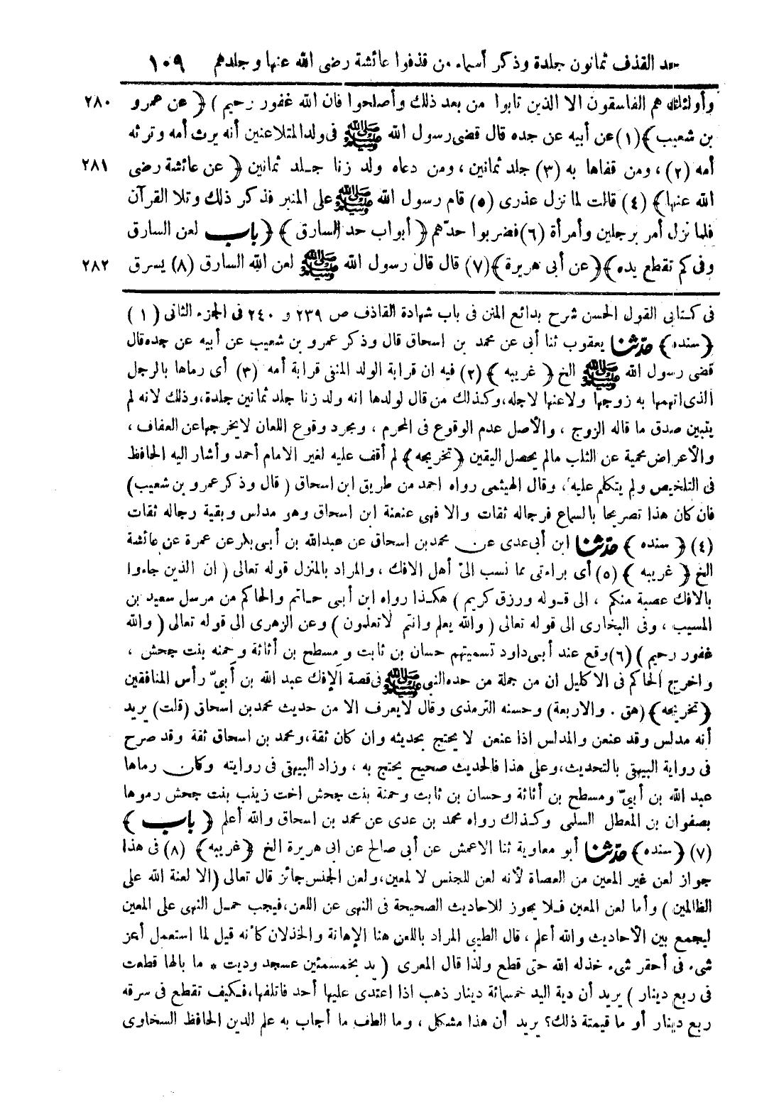 في كتابي القول الحسن شرح بدائع المنن فى باب شهادة القاذف ص 239 و 240 فى الجزء الثانى (1) (سنده) حدّثنا يعقوب ثنا أبى عن محمد بن اسحاق قال وذكر عمرو بن شعيب عن أبيه عن جده قال قضى رسول الله صلى الله عليه وسلم الخ (غريبه) (2) فيه ان قرابة الولد المنفى قرابة أمه (3) أى رماها بالرجل الذى اتهمها به زوجها ولاعنها لاجله، وكذلك من قال لولدها انه ولد زنا جلد ثمانين جلدة، وذلك لانه لم يتبين صدق ما قاله الزوج، والأصل عدم الوقوع فى المحرم، ومجرد وقوع اللعان لا يخرجها عن العفاف، والأعراض محمية عن الثلب ما لم يحصل اليقين (تخريجه) لم أقف عليه لغير الامام أحمد وأشار اليه الحافظ فى التلخيص ولم يتكلم عليه، وقال الهيثمى رواه احمد من طريق ابن اسحاق (قال وذكر عمرو بن شعيب) فان كان هذا تصريحا بالسماع فرجاله ثقات والا فهى عنعنة ابن اسحاق وهو مدلس وبقية رجاله ثقات (4) (سنده) حدّثنا ابن أبى عدى عن محمد بن اسحاق عن عبد الله بن أبى بكر عن عمرة عن عائشة الخ (غريبه) (5) أى براءتى مما نسب الىّ أهل الافك، والمراد بالمنزل قوله تعالى {ان الذين جاءوا بالافك عصبة منكم، الى قوله ورزق كريم} هكذا رواه ابن أبى حاتم والحاكم من مرسل سعيد بن المسيب، وفى البخارى الى قوله تعالى {والله يعلم وانتم لا تعلمون} وعن الزهرى الى قوله تعالى {والله غفور رحيم} (6) وقع عند أبى داود تسميتهم حسان بن ثابت ومسطح بن أثاثة وحمنه بنت جحش، واخرج الحاكم فى الاكليل ان من جملة من حده النبى صلى الله عليه وسلم فى قصة الإفك عبد الله بن أبيّ رأس المنافقين (تخريجه) (هق. والاربعة) وحسنه الترمذى وقال لا يعرف الا من حديث محمد بن اسحاق (قلت) يريد أنه مدلس وقد عنعن والمدلس اذا عنعن لا يحتج بحديثه وان كان ثقة، ومحمد بن اسحاق ثقة وقد صرح فى رواية البيهقى بالتحديث، وعلى هذا فالحديث صحيح يحتج به، وزاد البيهقى فى روايته وكان رماها عبد الله بن أبيّ ومسطح بن أثاثة وحسان بن ثابت وحمنة بنت جحش اخت زينب بنت جحش رموها بصفوان بن المعطل السلمى وكذلك رواه محمد بن عدى عن محمد بن اسحاق والله أعلم (باب) (7) (سنده) حدّثنا أبو معاوية ثنا الاعمش عن أبى صالح عن ابى هريرة الخ (غريبه) (8) فى هذا جواز لعن غير المعين من العصاة لأنه لعن للجنس لا لمعين، ولعن الجنس جائز قال تعالى {الا لعنة الله على الظالمين} وأما لعن المعين فلا يجوز للاحاديث الصحيحة فى النهى عن اللعن، فيجب حمل النهى على المعين ليجمع بين الأحاديث والله أعلم، قال الطيبى المراد باللعن هنا الإهانة والخذلان كأنه قيل لما استعمل أعز شئ فى أحقر شئ خذله الله حتى قطع ولذا قال المعرى (يد بخمسمئين عسجد وديت * ما بالها قطعت فى ربع دينار) يريد أن دية اليد خمسمائة دينار ذهب اذا اعتدى عليها أحد فاتلفها، فكيف تقطع فى سرقه ربع دينار أو ما قيمتة ذلك؟ يريد أن هذا مشكل، وما الطف ما أجاب به علم الدين الحافظ السخاوي