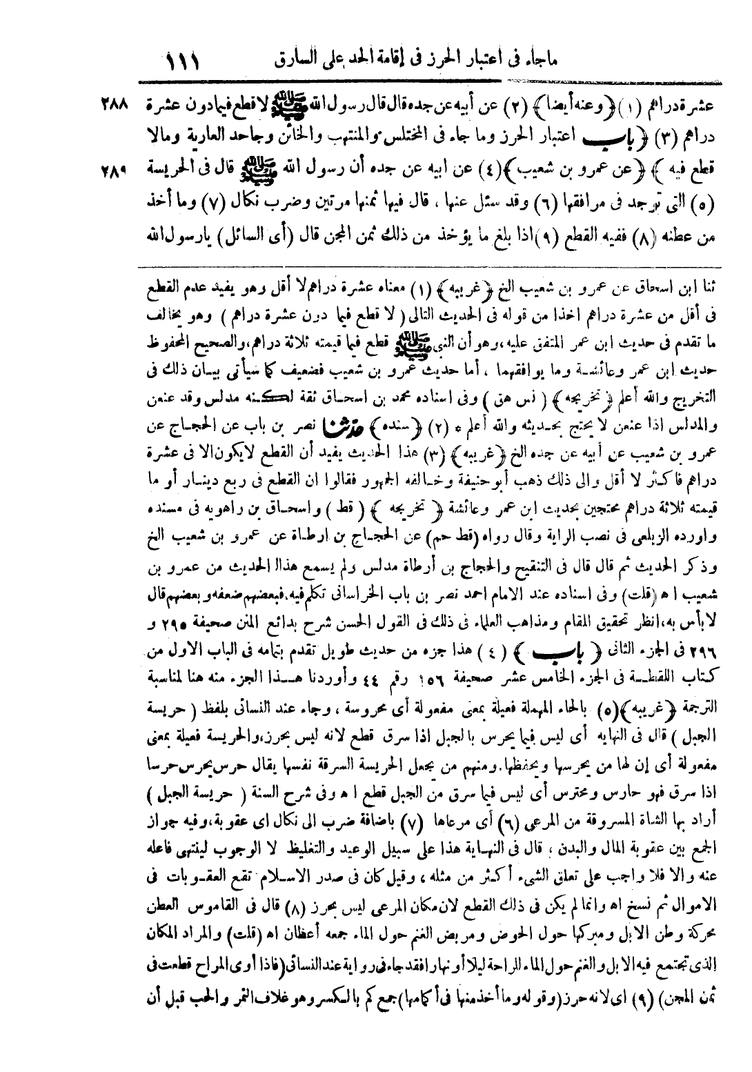 ثنا ابن إسحاق عن عمرو بن شعيب الخ (غريبه) (1) معناه عشرة دراهم لا أقل وهو يفيد عدم القطع فى أقل من عشرة دراهم اخذا من قوله فى الحديث التالى (لا قطع فيما دون عشرة دراهم) وهو يخالف ما تقدم فى حديث ابن عمر المتفق عليه، وهو أن النبى صلى الله عليه وسلم قطع فيما قيمته ثلاثة دراهم، والصحيح المحفوظ حديث ابن عمر وعائشة وما يوافقهما، أما حديث عمرو بن شعيب فضعيف كما سيأتى بيان ذلك فى التخريج والله أعلم (تخريجه) (نس هق) وفى اسناده محمد بن اسحاق ثقة لكنه مدلس وقد عنعن والمدلس اذا عنعن لا يحتج بحديثه والله أعلم * (2) (سنده) حدّثنا نصر بن باب عن الحجاج عن عمرو بن شعيب عن أبيه عن جده الخ (غريبه) (3) هذا الحديث يفيد أن القطع لا يكون الا فى عشرة دراهم فاكثر لا أقل والى ذلك ذهب أبو حنيفة وخالفه الجمهور فقالوا ان القطع فى ربع دينار أو ما قيمته ثلاثة دراهم محتجين بحديث ابن عمر وعائشة (تخريجه) (قط) واسحاق بن راهويه فى مسنده واورده الزيلعى فى نصب الراية وقال رواه (قط حم) عن الحجاج بن ارطاة عن عمرو بن شعيب الخ وذكر الحديث ثم قال قال فى التنقيح والحجاج بن أرطاة مدلس ولم يسمع هذا الحديث من عمرو بن شعيب اهـ (قلت) وفى اسناده عند الامام احمد نصر بن باب الخراسانى تكلم فيه، فبعضهم ضعفه وبعضهم قال لا بأس به، انظر تحقيق المقام ومذاهب العلماء فى ذلك فى القول الحسن شرح بدائع المنن صحيفة 295 و 296 فى الجزء الثانى (باب) (4) هذا جزء من حديث طويل تقدم بتمامه فى الباب الاول من كتاب اللقطة فى الجزء الخامس عشر صحيفة 156 رقم 44 وأوردنا هذا الجزء منه هنا لمناسبة الترجمة (غريبه) (5) بالحاء المهملة فعيلة بمعنى مفعولة أى محروسة، وجاء عند النسائى بلفظ (حريسة الجبل) قال فى النهايه أى ليس فيما يحرس بالجبل اذا سرق قطع لانه ليس بحرز، والحريسة فعيلة بمعنى مفعولة أى إن لها من يحرسها ويحفظها. ومنهم من يجعل الحريسة السرقة نفسها يقال حرس يحرس حرسا اذا سرق فهو حارس ومحترس أى ليس فيما سرق من الجبل قطع اهـ وفى شرح السنة (حريسة الجبل) أراد بها الشاة المسروقة من المرعى (6) أى مرعاها (7) باضافة ضرب الى نكال اى عقوبة، وفيه جواز الجمع بين عقوبة المال والبدن، قال فى النهاية هذا على سبيل الوعيد والتغليظ لا الوجوب لينتهى فاعله عنه والا فلا واجب على تعلق الشئ أكثر من مثله، وقيل كان فى صدر الاسلام تقع العقوبات فى الاموال ثم نسخ اهـ وانما لم يكن فى ذلك القطع لان مكان المرعى ليس بحرز (8) قال فى القاموس العطن محركة وطن الابل ومبركها حول الحوض ومربض الغنم حول الماء جمع أعطان اهـ (قلت) والمراد المكان الذى تجتمع فيه الابل والغنم حول الماء للراحة ليلا أو نهارا فقد جاء فى رواية عند النسائى (فاذا أوى المراح قطعت فى ثمن المجن) (9) اى لانه حرز (وقوله وما أخذ منها فى أكمامها) جمع كم بالكسر وهو غلاف الثمر والحب قبل أن