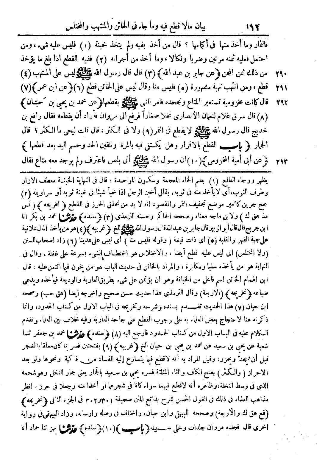 يظهر ووجاء الطلع (1) بضم الخاء المعجمة وسكون الموحدة، قال فى النهاية الخبنة معطف الازار وطرف الثوب، أى لا يأخذ منه فى ثوبه، يقال أخبن الرجل اذا خبأ شيئا فى خبنة ثوبه أو سراويله (2) جمع جرين كأمير موضع تجفيف التمر والمقصود انه لا بد من تحقق الحرز فى القطع (تخريجه) (نس مذ هق ك) ولابن ماجه معناه وصححه الحاكم وحسنه الترمذى (3) (سنده) حدّثنا محمد بن بكر انا ابن جريج قال قال أبو الزبير قال جابر بن عبد الله قال رسول الله صلى الله عليه وسلم الخ (غريبه) (4) هو من يأخذ المال علانية على جهة القهر والغلبة (5) اى ذات قيمة (وقوله فليس منا) أى ليس على هدينا (6) زاد اصحاب السنن (ولا المختلس) اى ليس عليه قطع أيضا، والاختلاس هو اختطاف الشئ بسرعة على غفلة، وقال فى النهاية هو من يأخذه سلبا ومكابرة، والمراد بالخائن فى حديث الباب هو من يخون فيما ائتمن عليه، قال ابن الهمام الخائن اسم فاعل من الخيانة وهو ان يؤتمن على شئ بطريق العارية والوديعة فيأخذه ويدعى ضياعه (تخريجه) (الاربعة) وقال الترمذى هذا حديث حسن صحيح واخرجه ايضا (هق حب) وصححه ابن حبان (7) هذا الحديث تقدم بسنده وشرحه وتخريجه فى الباب الاول من كتاب الحدود، وانما ذكرته هنا لاحتجاج بعض العلماء به على وجوب القطع على جاحد العارية وفيه خلاف بين العلماء وتقدم الكلام عليه فى الباب الاول من كتاب الحدود فارجع اليه (8) (سنده) حدّثنا محمد بن جعفر ثنا شعبة عن يحيى بن سعيد عن محمد بني يحيى بن حبان الخ (غريبه) (9) بفتحتين فسر بما كان معلقا بالشجر قبل أن يجدّ ويحرز، وقيل المراد به أنه لا قطع فيما يتسارع إليه الفساد من فاكهة ونحوها ولو بعد الاحراز (والكثر) بفتح الكاف والثاء المثلثة فسره يحيى بن سعيد بالجّمار يعنى جمار النخل وهو شحمه الذى فى وسط النخلة، وظاهره أنه لا قطع فيهما سواء كانا فى شجرهما او أخذا منه وجعلا فى حرز، انظر مذاهب العلماء فى ذلك فى القول الحسن شرح بدائع المنن صحيفة 301 و 302 فى الجزء الثانى (تخريجه) (فع هق ك. والأربعة) وصححه البيهقى وابن حبان، واختلف فى وصله وارساله، وزاد البيهقى فى رواية اخرى قال فجلده مروان جلدات وخلى سبيله (باب) (10) (سنده) حدّثنا بهز ثنا حماد أنا