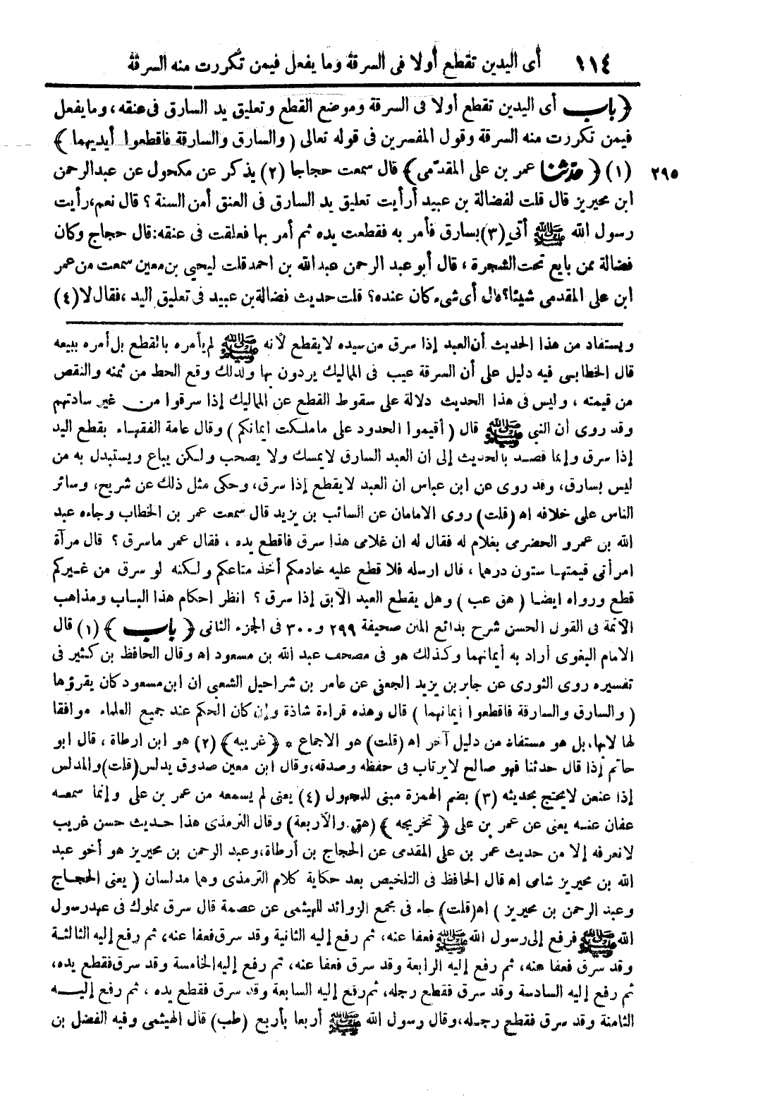 (باب أي اليدين تقطع أولا فى السرقة وموضع القطع وتعليق يد السارق فى عنقه، وما يفعل فيمن تكررت منه السرقة وقول المفسرين فى قوله تعالى {والسارق والسارقة فاقطعوا أيديهما} (1) (حدّثنا عمر بن على المقدّمى) قال سمعت حجاجا (2) يذكر عن مكحول عن عبد الرحمن ابن محيريز قال قلت لفضالة بن عبيد أرأيت تعليق يد السارق فى العنق أمن السنة؟ قال نعم، رأيت رسول الله صلى الله عليه وسلم أتى (3) بسارق فأمر به فقطعت يده ثم أمر بها فعلقت فى عنقه: قال حجاج وكان فضالة ممن بايع تحت الشجرة، قال أبو عبد الرحمن عبد الله بن احمد قلت ليحيى بن معين سمعت من عمر ابن على المقدمى شيئا؟ قال أى شئ كان عنده؟ قلت حديث فضالة بن عبيد فى تعليق اليد، فقال لا (4)