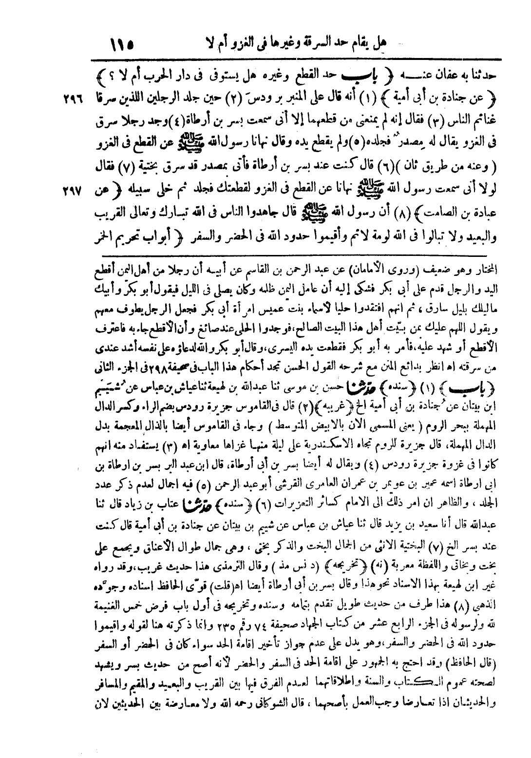 المختار وهو ضعيف (وروى الأمامان) عن عبد الرحمن بن القاسم عن أبيه أن رجلا من أهل اليمن أقطع اليد والرجل قدم على أبى بكر فشكى إليه أن عامل اليمن ظلمه وكان يصلى فى الليل فيقول أبو بكر وأبيك ما ليلك بليل سارق، ثم انهم افتقدوا حليا لأسماء بنت عميس امرأة أبى بكر فجعل الرجل يطوف معهم ويقول اللهم عليك بمن بيّت أهل هذا البيت الصالح، فوجدوا الحلى عند صائغ وأن الأقطع جاء به فاعترف الأقطع أو شهد عليه، فأمر به أبو بكر فقطعت يده اليسرى، وقال أبو بكر والله لدعاؤه على نفسه أشد عندى من سرقته اهـ انظر بدائع المنن مع شرحه القول الحسن تجد أحكام هذا الباب فى صحيفة 298 فى الجزء الثانى (باب) (1) (سنده) حدّثنا حسن بن موسى ثنا عبد الله بن لهيعة ثنا عياش بن عباس عن شييم ابن بيتان عن جنادة بن أبى أمية الخ (غريبه) (2) قال فى القاموس جزيرة رودس بضم الراء وكسر الدال المهملة ببحر الروم (يعنى المسمى الان بالابيض المتوسط) وجاء فى القاموس أيضا بالذال المعجمة بدل الدال المهملة، قال جزيرة للروم تجاه الاسكندرية على ليلة منها غزاها معاوية اهـ (3) يستفاد منه انهم كانوا فى غزوة جزيرة رودس (4) ويقال له أيضا بسر بن أبى أرطاة، قال ابن عبد البر بسر بن ارطاة بن ابى ارطاة اسمه عمير بن عويمر بن عمران العامرى القرشى أبو عبد الرحمن (5) فيه اجمال لعدم ذكر عدد الجلد، والظاهر ان امر ذلك الى الامام كسائر التعزيرات (6) (سنده) حدّثنا عتاب بن زياد قال ثنا عبد الله قال أنا سعيد بن يزيد قال ثنا عياش بن عباس عن شييم بن بيتان عن جنادة بن أبى أمية قال كنت عند بسر الخ (7) البختية الانثى من الجمال البخت والذكر بختى، وهى جمال طوال الأعناق ويجمع على بخت وبخاتى واللفظة معربة (نه) (تخريجه) (د نس مذ) وقال الترمذى هذا حديث غريب، وقد رواه غير ابن لهيعة بهذا الاسناد نحو هذا وقال بسر بن أبى أرطاة أيضا اهـ (قلت) قوّى الحافظ اسناده وجوَّده الذهبى (8) هذا طرف من حديث طويل تقدم بتمامه وسنده وتخريجه فى أول باب فرض خمس الغنيمة لله ولرسوله فى الجزء الرابع عشر من كتاب الجهاد صحيفة 74 رقم 235 وانما ذكرته هنا لقوله واقيموا حدود الله فى الحضر والسفر، وهو يدل على عدم جواز تأخير اقامة الحد سواء كان فى الحضر أو السفر (قال الحافظ) وقد احتج به الجمهور على اقامة الحد فى السفر والحضر لأنه أصح من حديث بسر ويشهد لصحته عموم الكتاب والسنة واطلاقاتهما لعدم الفرق فيها بين القريب والبعيد والمقيم والمسافر والحديثان اذا تعارضا وجب العمل بأصحهما، قال الشوكانى رحمه الله ولا معارضة بين الحديثين لأن