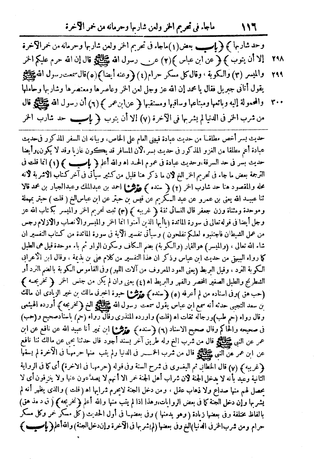 حديث بسر أخص مطلقا من حديث عبادة فيبنى العام على الخاص، وبيانه ان السفر المذكور فى حديث عبادة أعم مطبقا من الغزو المذكور فى حديث بسر، لأن المسافر قد يكون غازيا وقد لا يكون، وأيضا حديث بسر فى حد السرقة، وحديث عبادة فى عموم الحد اهـ والله أعلم (باب) (1) انما قلت فى الترجمة بعض ما جاء فى تحريم الخمر الخ لأن ما ذكر هنا قليل من كثير سيأتى فى آخر كتاب الأشربة لأنه محله والمقصود هنا حد شارب الخمر (2) (سنده) حدّثنا احمد بن عبد الملك وعبد الجبار بن محمد قالا ثنا عبيد الله يعنى بن عمرو عن عبد الكريم عن قيس بن حبتر عن ابن عباس الخ (قلت) حبتر بمهملة وموحدة ومثناة وزن جعفر قال النسائى ثقة (غريبه) (3) ثبت تحريم الخمر والميسر بكتاب الله عز وجل أيضا فى قوله تعالى فى سورة المائدة {يا أيها الذين آمنوا انما الخمر والميسر والأنصاب والأزلام رجس من عمل الشيطان فاجتنبوه لعلكم تفلحون} وسيأتى تفسير الآية فى سورة المائدة من كتاب التفسير ان شاء الله تعالى، (والميسر) هو القمار (والكوبة) بضم الكاف وسكون الواو ثم باء موحدة قيل هى الطبل كما رواه البيهقى من حديث ابن عباس وذكر ان هذا التفسير من كرم على بن بذيمة، وقال ابن الأعرابى الكوبة النرد، وقيل البربط (يعنى العود المعروف من آلات اللهو) وفى القاموس الكوبة بالضم النرد أو الشطرنج والطبل الصغير المخصر والفهر والبريط اهـ (4) يعنى وان لم يكن من جنس الخمر (تخريجه) (حب هق) وفى اسناده من لم أعرفه (5) (سنده) حدّثنا حيوة اخبرنى مالك بن خير الزيادى ان مالك بن سعد التجيبى حدثه أنه سمع ابن عباس يقول سمعت رسول الله صلى الله عليه وسلم الخ (تخريجه) أورده الهيثمى وقال رواه (حم طب) ورجاله ثقات اهـ (قلت) واورده المنذرى وقال رواه (حم) باسناد صحيح و (حب) فى صحيحه والحاكم وقال صحيح الاسناد (6) (سنده) حدّثنا ابن نمير أنا عبيد الله عن نافع عن ابن عمر عن النبى صلى الله عليه وسلم قال من شرب الخ وله طريق آخر بسند أجود قال حدثنا يحيى عن مالك ثنا نافع عن ابن عمر عن النبى صلى الله عليه وسلم قال من شرب الخمر فى الدنيا ولم يتب منها حرمها فى الآخرة لم يسقها (غريبه) (7) قال الخطابى ثم البغوى فى شرح السنة وفى قوله (حرمها فى الاخرة) أى كما فى الرواية الثانية وعيد بأنه لا يدخل الجنة لأن شراب أهل الجنة خمر الا أنهم لا يصدَّعون عنها ولا ينزفون أى لا يحصل لهم منها صداع ولا ذهاب عقل، ومن دخل الجنة لا يحرم شرابها اهـ (قلت) والذى يظهر أنه لم يشربها وإن دخل الجنة كما فى بعض الروايات، وهذا اذا لم يتب منها والله أعلم (تخريجه) (ق د مذ هق) بالفاظ مختلفة وفى بعضها زيادة (وهو يدمنها) وفى بعضها فى أول الحديث (كل مسكر خمر وكل مسكر حرام ومن شرب الخمر فى الدنيا) الخ وفى بعضها (لم يشربها فى الآخرة وإن دخل الجنة) والله أعلم (باب)