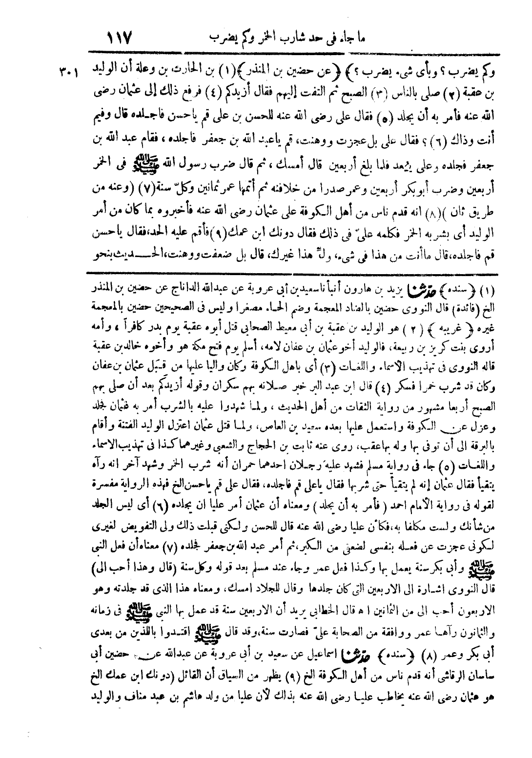 (1) (سنده) حدّثنا يزيد بن هارون أنبأنا سعيد بن أبى عروبة عن عبد الله الداناج عن حضين بن المنذر الخ (فائدة) قال النووى حضين بالضاد المعجمة وضم الحاء مصغرا وليس فى الصحيحين حضين بالمعجمة غيره (غريبه) (2) هو الوليد بن عقبة بن أبى معيط الصحابى قتل أبوه عقبة يوم بدر كافرا، وأمه أروى بنت كريز بن ربيعة، فالوليد أخو عثمان بن عفان لامه، أسلم يوم فتح مكة هو وأخوه خالد بن عقبة قاله النووى فى تهذيب الأسماء واللغات (3) أى باهل الكوفة وكان واليا عليها من قبل عثمان بن عفان وكان قد شرب خمرا فسكر (4) قال ابن عبد البر خير صلاته بهم سكران وقوله أزيدكم بعد أن صلى بهم الصبح أربعا مشهور من رواية الثقات من أهل الحديث، ولما شهدوا عليه بالشرب أمر به عثمان فجلد وعزل عن الكوفة واستعمل عليها بعده سعيد بن العاص، ولما قتل عثمان اعتزل الوليد الفتنة وأقام بالبرقة الى أن توفى بها وله بها عقب، روى عنه ثابت بن الحجاج والشعبى وغيرهما كذا فى تهذيب الاسماء واللغات (5) جاء فى رواية مسلم فشهد عليه رجلان احدهما حمران أنه شرب الخمر وشهد آخر انه رآه يتقيأ فقال عثمان إنه لم يتقيأ حتى شربها فقال يا على قم فاجلده، فقال على قم يا حسن الخ فهذه الرواية مفسرة لقوله فى رواية الأمام احمد (فأمر به أن يجلد) ومعناه أن عثمان أمر عليا ان يجلده (6) أى ليس الجلد من شأنك ولست مكلفا به، فكأن عليا رضى الله عنه قال للحسن ولكنى قبلت ذلك ولى التفويض لغيرى لكونى عجزت عن فعله بنفسى لضعفى من الكبر، ثم أمر عبد الله بن جعفر فجلده (7) معناه أن فعل النبى صلى الله عليه وسلم وأبى بكر سنة يعمل بها وكذا فعل عمر وجاء عند مسلم بعد قوله وكل سنة (قال وهذا أحب الى) قال النووى اشارة الى الاربعين التى كان جلدها وقال للجلاد امسك، ومعناه هذا الذى قد جلدته وهو الاربعون أحب الى من الثمانين اهـ قال الخطابى يريد أن الاربعين سنة قد عمل بها النبى صلى الله عليه وسلم فى زمانه والثمانون رآها عمر ووافقة من الصحابة علىّ فصارت سنة، وقد قال صلى الله عليه وسلم اقتدوا باللذين من بعدى أبى بكر وعمر (8) (سنده) حدّثنا اسماعيل عن سعيد بن أبى عروبة عن عبد الله عن حضين أبى ساسان الرقاشى أنه قدم ناس من أهل الكوفة الخ (9) يظهر من السياق أن القائل (دونك ابن عمك الخ هو عثمان رضى الله عنه يخاطب عليا رضى الله عنه بذلك لأن عليا من ولد هاشم بن عبد مناف والوليد