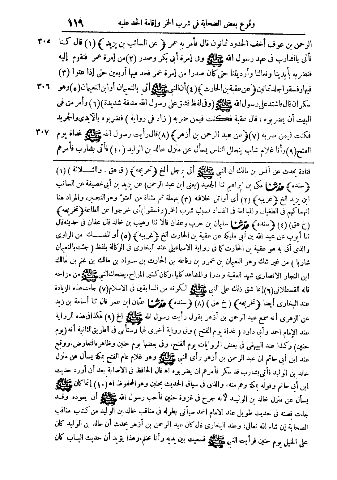 الرحمن بن عوف أخف الحدود ثمانون قال فأمر به عمر (عن السائب بن يزيد) (1) قال كنا نأتى بالشارب فى عهد رسول الله صلى الله عليه وسلم وفى إمرة أبى بكر وصدر (2) من إمرة عمر فنقوم إليه فنضربه بأيدينا ونعالنا وأرديتنا حتى كان صدرا من إمرة عمر فحد فيها أربعين حتى إذا عتوا (3) فيها وفسقوا جلد ثمانين (عن عقبة بن الحارث) (4) أن النبى صلى الله عليه وسلم أتى بالنعيمان أو ابن النعيمان (5) وهو سكران قال فاشتد على رسول الله صلى الله عليه وسلم (وفى لفظ فشق على رسول الله مشقة شديدة) (6) وأمر من فى البيت أن يضربوه، قال عقبة فكنت فيمن ضربه (زاد فى رواية) فضربوه بالأيدى والجريد فكنت فيمن ضربه (7) (عن عبد الرحمن بن أزهر) (8) قال رأيت رسول الله صلى الله عليه وسلم غداة يوم الفتح (9) وأنا غلام شاب يتخلل الناس يسأل عن منزل خالد بن الوليد (10) فأتى بشارب فأمرهم