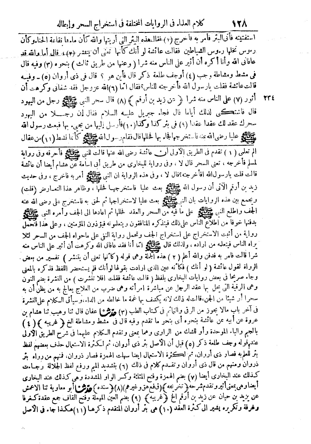 استفتيته فأتى البئر فأمر به فأخرج (1) فقال هذه البئر التى أريتها والله كأن ماءها نقاعة الحناء وكأن رءوس نخلها رءوس الشياطين فقالت عائشة لو أنك كأنها تعنى أن ينتشر (2)، قال أما والله قد عافانى الله وأنا أكره أن أثير على الناس منه شرا (وعنها من طريق ثالث) بنحوه (3) وفيه قال فى مشط ومشاطة وجب (4) أو جف طلعة ذكر قال فأين هو؟ قال فى ذى أروان (5) - وفيه قالت عائشة فقلت يا رسول الله فأخرجته للناس؟ فقال امّا (6) الله عز وجل فقد شفانى وكرهت أن أثور (7) على الناس منه شرا (عن زيد بن أرقم) (8) قال سحر النبى صلى الله عليه وسلم رجل من اليهود قال فاشتكى لذلك أياما قال فجاء جبريل عليه السلام فقال إن رجلا من اليهود سحرك عقد لك عقدا عقدا (9) فى بئر كذا وكذا (10) فأرسل إليها من يجيء بها فبعث رسول الله صلى الله عليه وسلم عليا رضى الله عنه فاستخرجها بها فحللها قال فقام رسول الله صلى الله عليه وسلم كأنما نشط (11) من عقال