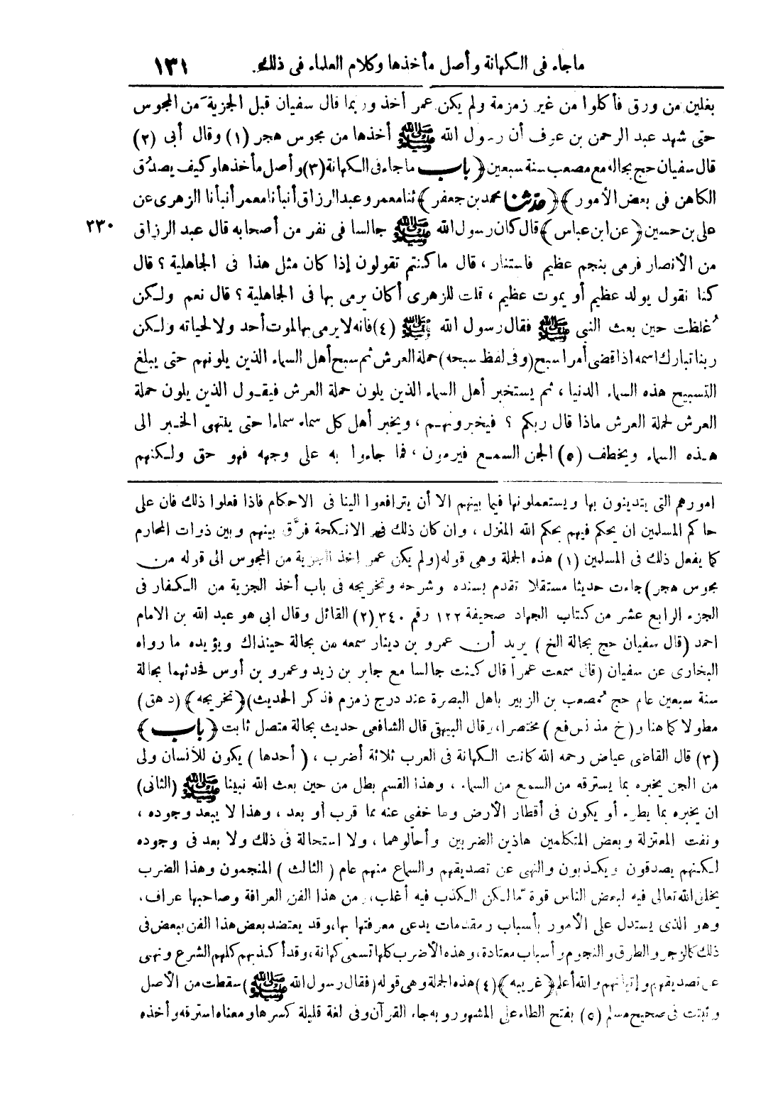 بغلين من ورق فأكلوا من غير زمزمة ولم يكن عمر أخذ وربما قال سفيان قبل الجزية من المجوس حتى شهد عبد الرحمن بن عوف أن رسول الله صلى الله عليه وسلم أخذها من مجوس هجر (1) وقال أبى (2) قال سفيان حج بجاله مع مصعب سنة سبعين (باب ما جاء فى الكهانة (3) وأصل مأخذها وكيف يصدق الكاهن فى بعض الأمور) (حدّثنا محمد بن جعفر) ثنا معمر وعبد الرزاق أنبأنا معمر أنبأنا الزهرى عن على بن حسين (عن ابن عباس) قال كان رسول الله صلى الله عليه وسلم جالسا فى نفر من أصحابه قال عبد الرزاق من الأنصار فرمى بنجم عظيم فاستنار، قال ما كنتم تقولون إذا كان مثل هذا فى الجاهلية؟ قال كنا نقول يولد عظيم أو يموت عظيم، قلت للزهرى أكان يرمى بها فى الجاهلية؟ قال نعم ولكن غلظت حين بعث النبى صلى الله عليه وسلم فقال رسول الله صلى الله عليه وسلم (4) فانه لا يرمى بها لموت أحد ولا لحياته ولكن ربنا تبارك اسمه اذا قضى أمرا سبح (وفى لفظ سبحه) حملة العرش ثم سبح أهل السماء الذين يلونهم حتى يبلغ التسبيح هذه السماء الدنيا، ثم يستخبر أهل السماء الذين يلون حملة العرش فيقول الذين يلون حملة العرش لحملة العرش ماذا قال ربكم؟ فيخبرونهم، ويخبر أهل كل سماء سماءا حتى ينتهى الخبر الى هذه السماء ويخطف (5) الجن السمع فيرمون، فما جاءوا به على وجهه فهو حق ولكنهم