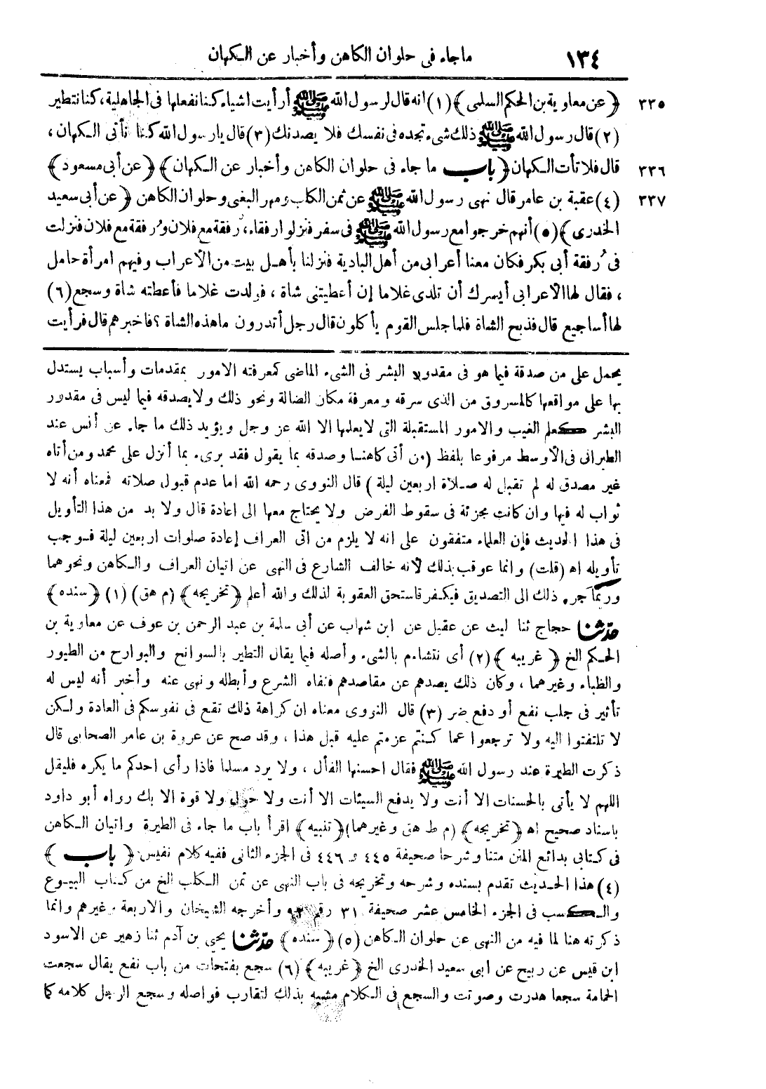يحمل على من صدقة فيما هو فى مقدور البشر فى الشئ الماضى كمعرفته الامور بمقدمات وأسباب يستدل بها على مواقعها كالمسروق من الذى سرقه ومعرفة مكان الضالة ونحو ذلك ولا يصدقه فيما ليس فى مقدور البشر كعلم الغيب والامور المستقبلة التى لا يعلمها الا الله عز وجل ويؤيد ذلك ما جاء عن أنس عند الطبرانى فى الأوسط مرفوعا بلفظ (من أتى كاهنا وصدقه بما يقول فقد برئ بما أنزل على محمد ومن أتاه غير مصدق له لم تقبل له صلاة اربعين ليلة) قال النووى رحمه الله اما عدم قبول صلاته فمعناه أنه لا ثواب له فيها وان كانت مجزئة فى سقوط الفرض ولا يحتاج معها الى اعادة قال ولا بد من هذا التأويل فى هذا الحديث فإن العلماء متفقون على انه لا يلزم من اتى العراف الى إعادة صلوات اربعين ليلة فوجب تأويله اهـ (قلت) وانما عوقب بذلك لأنه خالف الشارع فى النهى عن اتيان العراف والكاهن ونحوهما وربما جره ذلك الى التصديق فيكفر فاستحق العقوبة لذلك والله أعلم (تخريجه) (م هق) (1) (سنده) حدّثنا حجاج ثنا ليث عن عقيل عن ابن شهاب عن أبى سلمة بن عبد الرحمن بن عوف عن معاوية بن الحكم الخ (غريبه) (2) أى نتشاءم بالشئ وأصله فيما يقال التطير بالسوانح والبوارح من الطيور والظباء وغيرهما، وكان ذلك يصدهم عن مقاصدهم فنفاه الشرع وأبطله ونهى عنه وأخبر أنه ليس له تأثير فى جلب نفع أو دفع ضر (3) قال النووى معناه ان كراهة ذلك تقع فى نفوسكم فى العادة ولكن لا تلتفتوا اليه ولا ترجعوا عما كنتم عزمتم عليه قبل هذا، وقد صح عن عروة بن عامر الصحابى قال ذكرت الطيرة عند رسول الله صلى الله عليه وسلم فقال احسنها الفأل، ولا يرد مسلما فاذا رأى احدكم ما يكره فليقل اللهم لا يأتى بالحسنات الا أنت ولا يدفع السيئات الا أنت ولا حول ولا قوة الا بك رواه أبو داود باسناد صحيح اهـ (تخريجه) (م ط هق وغيرهما) (تنبيه) اقرأ باب ما جاء فى الطيرة واتيان الكاهن فى كتابى بدائع المنن متنا وشرحا صحيفة 445 و 446 فى الجزء الثانى ففيه كلام نفيس (باب) (4) هذا الحديث تقدم بسنده وشرحه وتخريجه فى باب النهى عن ثمن الكلب الخ من كتاب البيوع والكسب فى الجزء الخامس عشر صحيفة 31 رقم 92 وأخرجه الشيخان والاربعة. غيرهم وانما ذكرته هنا لما فيه من النهى عن حلوان الكاهن (5) (سنده) حدّثنا يحيى بن آدم ثنا زهير عن الاسود ابن قيس عن ربيح عن ابى سعيد الخدرى الخ (غريبه) (6) سجع بفتحات من باب نفع يقال سجعت الحمامة سجعا هدرت وصوتت والسجع فى الكلام مشيه بذلك لتقارب فواصله وسجع الرجل كلامه كما