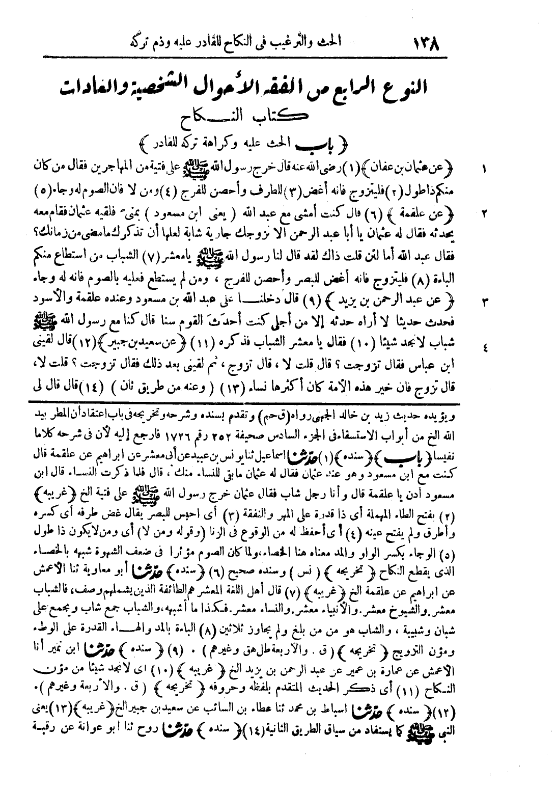 (عن عثمان بن عفان) (1) رضى الله عنه قال خرج رسول الله صلى الله عليه وسلم على فتية من المهاجرين فقال من كان منكم ذا طول (2) فليتزوج فانه أغض (3) للطرف وأحصن للفرج (4) ومن لا فان الصوم له وجاء (5) (عن علقمة) (6) قال كنت أمشى مع عبد الله (يعنى ابن مسعود) بمنى فلقيه عثمان فقام معه يحدثه فقال له عثمان يا أبا عبد الرحمن الا نزوجك جارية شابة لعلها أن تذكرك ما مضى من زمانك؟ فقال عبد الله أما لئن قلت ذاك لقد قال لنا رسول الله صلى الله عليه وسلم يا معشر (7) الشباب من استطاع منكم الباءة (8) فليتزوج فانه أغض للبصر وأحصن للفرج، ومن لم يستطع فعليه بالصوم فانه له وجاء (عن عبد الرحمن بن يزيد) (9) قال دخلنا على عبد الله بن مسعود وعنده علقمة والأسود فحدث حديثا لا أراه حدثه إلا من أجلى كنت أحدث القوم سنا قال كنا مع رسول الله صلى الله عليه وسلم شباب لا نجد شيئا (10) فقال يا معشر الشباب فذكره (11) (عن سعيد بن جبير) (12) قال لقينى ابن عباس فقال تزوجت؟ قال قلت لا، قال تزوج، ثم لقينى بعد ذلك فقال تزوجت؟ قلت لا، قال تزوج فان خير هذه الأمة كان أكثرها نساء (13) (وعنه من طريق ثان) (14) قال قال لي