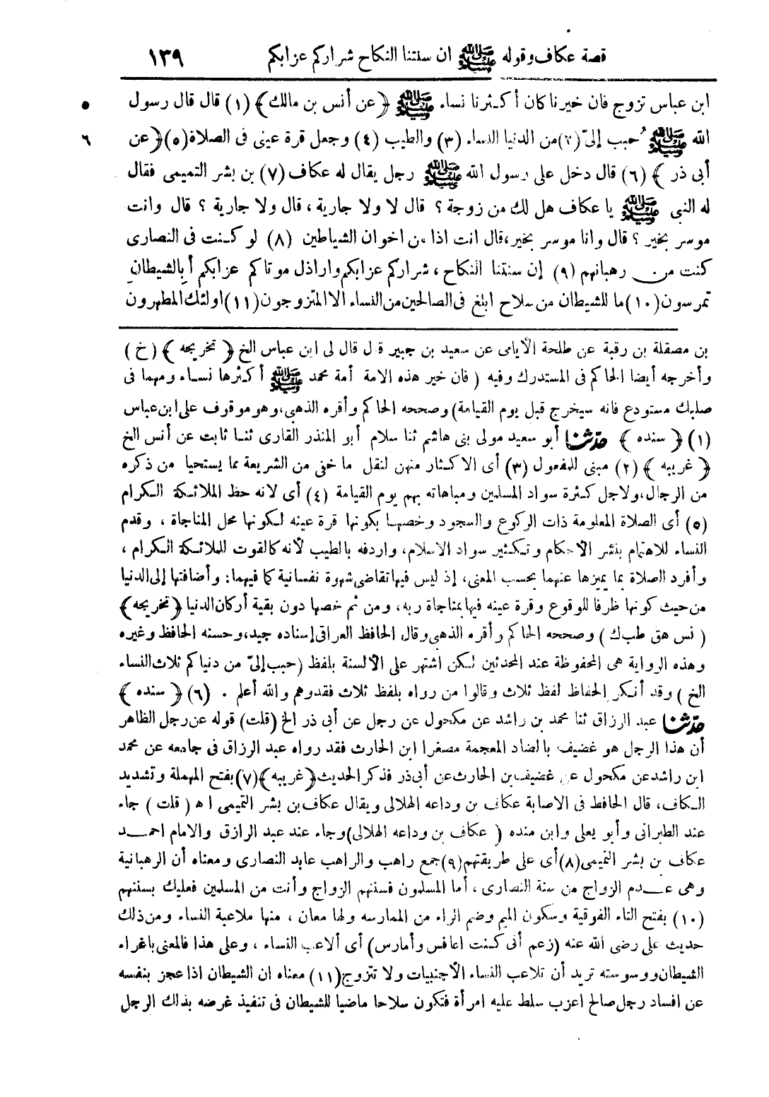 ابن عباس تزوج فان خيرنا كان أكثرنا نساء صلى الله عليه وسلم (عن أنس بن مالك) (1) قال قال رسول الله صلى الله عليه وسلم حبب إلىّ (2) من الدنيا النساء (3) والطيب (4) وجعل قرة عينى فى الصلاة (5) (عن أبى ذر) (6) قال دخل على رسول الله صلى الله عليه وسلم رجل يقال له عكاف (7) بن بشر التميمى فقال له النبى صلى الله عليه وسلم يا عكاف هل لك من زوجة؟ قال لا ولا جارية، قال ولا جارية؟ قال وانت موسر بخير؟ قال وانا موسر بخير، قال انت اذا من اخوان الشياطين (8) لو كنت فى النصارى كنت من رهبانهم (9) إن سنتنا النكاح، شراركم عزابكم واراذل موتاكم عزابكم أبالشيطان تمرسون (10) ما للشيطان من سلاح ابلغ فى الصالحين من النساء الا المتزوجون (11) أولئك المطهرون