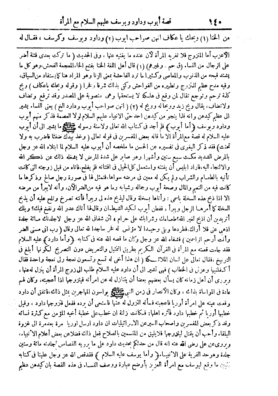 الأعزب أما المتزوج فلا تغريه المرأة لأن عنده ما يغنيه عنها، وفى الحديث (ما تركت بعدى فتنة أضر على الرجال من النساء (ق حم وغيرهم) (1) قال أهل اللغة الخنا بفتح الخاء المعجمة الفحش، وهو كل ما يشتد قبحه من الذنوب والمعاصى وكثيرا ما ترد الفاحشة بمعنى الزنا وهو المراد هنا كما يستفاد من السياق، وفيه مدح عظيم للمتزوج وتطهيره من الفواحش وكفى بذلك شرفا وفخرا (وقوله ويحك يا عكاف) ويح كلمة ترحم وتوجع تقال لمن وقع فى هلكة لا يستحقها وهى منصوبة على المصدر وقد ترفع وتضاف ولا تضاف، يقال ويح زيد وويحا له وويح له (2) (انهن صواحب أيوب وداود الخ) يعنى النساء يشير الى عظيم كيدهن وانه قلما ينجو من كيدهن احد حتى الانبياء عليهم السلام لولا العصمة فذكر منهم أيوب وداود ويوسف (أما أيوب) فلم أجد فى كتاب الله تعالى ولا سنة رسوله صلى الله عليه وسلم ما يشير الى أن أيوب عليه السلام له قصة مع المرأة الا ما قاله بعض المفسرين فى قوله تعالى {وخذ بيدك ضغثا فاضرب به ولا تحنث} فقد ذكر البغوى فى تفسيره عن الحسن ما ملخصه أن أيوب عليه السلام لما ابتلاه الله عز وجل بالمرض الشديد مكث سبع سنين وأشهرا وهو صابر على شدة المرض لا يشغله ذلك عن ذكر الله والالتجاء اليه، فاراد ابليس أن يفتنه واستعمل كل الحيل فى افتتانه فلم يفلح، فاتاه من قبل زوجته التى كانت تأتيه بالطعام والشاب ولم يكن له معين فى مرضه سواها، فتمثل لها فى صورة رجل صالح وذكرها ما كانت فيه من النعيم والمال وصحة أيوب وجماله وشبابه وما هو فيه من الضر الآن، وأنه لا يبرأ من مرضه الا اذا ذبح هذه السخلة باسمى: وأتاها بسخلة وقال ليذبح هذه لى ويبرأ فأتته تصرخ وتلح عليه أن يذبح السخلة كما أمرها الرجل ويبرأ، ففطن أيوب لكيد الشيطان وقال لها أتاك عدو الله ونفخ فيك؟ ويلك أتريدين أن اذبح لغير الله؟ طعامك وشرابك على حرام، لئن شفانى الله عز وجل لاجلدنك مائة جلدة اذهبى عنى فلا أراك، فطردها وبقى وحيدا لا مؤنس له فخر ساجدا لله تعالى وقال {رب انى مسنى الضر وأنت أرحم الراحمين} فشفاه الله عز وجل وكان ما قصه الله عنه فى كتابه (وأما داود) عليه السلام فقد جاءت قصته مع المرأة فى القرآن الكريم بطريق التمثيل والتعريض دون التصريح لكونها أبلغ فى التوبيخ، فقال تعالى على لسان الملائكة {ان هذا أخى له تسع وتسعون نعجة ولى نعجة واحدة فقال أكفلنيها وعزنى فى الخطاب} فهى تشير الى أن داود عليه السلام طلب الى زوج المرأة أن ينزل له عنها، ويروى أن أهل زمانه كان يسأل بعضهم بعضا أن يتنازل له عن امرأته فيتزوجها اذا أعجبته، وكان لهم عادة فى المواساة بذلك، وكان الأنصار فى زمن النبى صلى الله عليه وسلم يواسون المهاجرين بمثل ذلك، فاتفق أن داود وقعت عينه على امرأة أوريا فاعجبته فسأله النزول له عنها فاستحى أن يرده ففعل فتزوجها داود، وقيل خطبها أوريا ثم خطبها داود فآثره اهلها: فكانت زلتة ان خطب على خطبة أخيه المؤمن مع كثرة نسائه وقد ذكر بعض المفسرين واصحاب السير عن الاسرائيليات ان داود ارسل اوريا مرة بعد مرة الى غزوة البلقاء وأحب أن يقتل ليتزوجها فلا يليق من المتسمين بالصلاح فعل ذلك فضلا عن بعض أعلام الأنبياء، ويروى عن على رضى الله عنه انه قال من حدثكم بحديث داود على ما يرويه القصاص جلدته مائة وستين جلدة وهو حد الفرية على الأنبياء (وأما يوسف عليه السلام) فقد قص الله عز وجل علينا فى كتابه تبيين ما وقع ليوسف مع امرأة العزيز بأوضح عبارة ووصف النساء فى هذه القصة بأن كيدهن عظيم