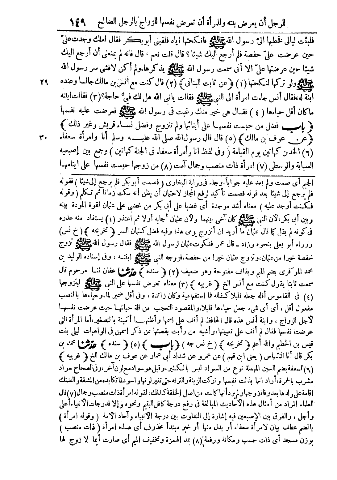 فلبثت ليالي فخطبها الىَّ رسول الله صلى الله عليه وسلم فانكحتها اياه فلقينى أبو بكر فقال لعلك وجدت علىّ حين عرضت علىّ حفصة فلم أجع اليك شيئا؟ قال قلت نعم، قال فانه لم يمنعنى أن أرجع اليك شيئا حين عرضتها علىّ الا أنى سمعت رسول الله صلى الله عليه وسلم يذكرها، ولم أكن لافشى سر رسول الله صلى الله عليه وسلم ولو تركها لنكحتها (1) (عن ثابت البنانى) (2) قال كنت مع انس بن مالك جالسا وعنده ابنة له، فقال أنس جاءت امرأة الى النبى صلى الله عليه وسلم فقالت يا نبى الله هل لك فيَّ حاجة؟ (3) فقالت ابنته ما كان أقل حياءها (4) فقال هى خير منك رغبت فى رسول الله صلى الله عليه وسلم فعرضت عليه نفسها (باب فضل من حبست نفسها على أبنائها ولم تتزوج وفضل نساء قريش وغير ذلك) (عن عوف بن مالك) (5) قال قال رسول الله صلى الله عليه وسلم أنا وامرأة سعفاء (6) الخدين كهاتين يوم القيامة (وفى لفظ انا وأمرأة سعفاء فى الجنة كهاتين) وجمع بين إصبعيه السبابة والوسطى (7) امرأة ذات منصب وجمال آمت (8) من زوجها حبست نفسها على أيتامها