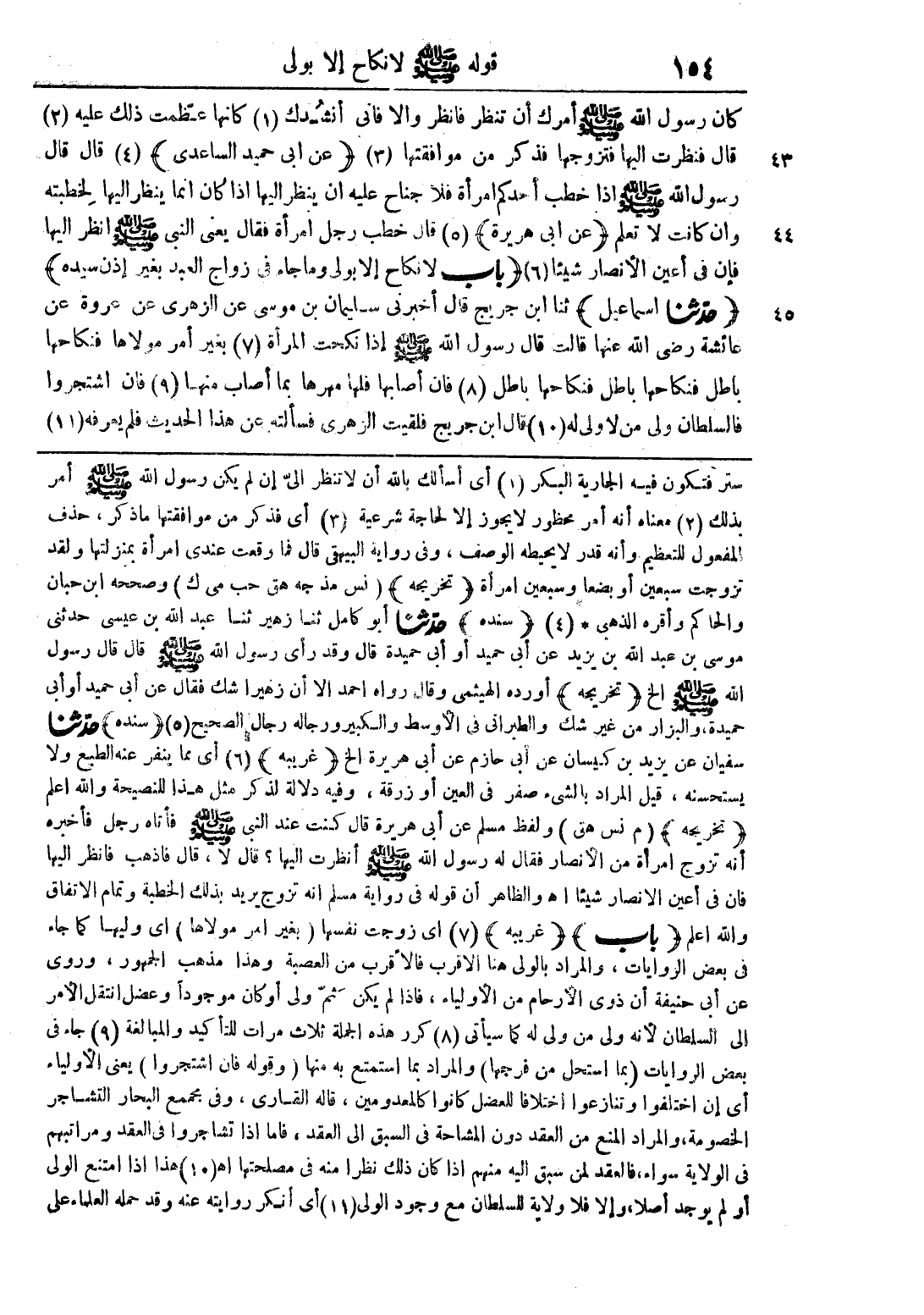 كان رسول الله صلى الله عليه وسلم أمرك أن تنظر فانظر والا فانى أنشدك (1) كانها عظّمت ذلك عليه (2) قال فنظرت اليها فتزوجها فذكر من موافقتها (3) (عن ابى حميد الساعدى) (4) قال قال رسول الله صلى الله عليه وسلم اذا خطب أحدكم امرأة فلا جناح عليه ان ينظر اليها اذا كان انما ينظر اليها لخطبته وان كانت لا تعلم (عن ابى هريرة) (5) قال خطب رجل امرأة فقال يعنى النبى صلى الله عليه وسلم انظر اليها فإن فى أعين الأنصار شيئا (6) (باب لا نكاح إلا بولى وما جاء فى زواج العبد بغير إذن سيده) (حدّثنا اسماعيل) ثنا ابن جريج قال أخبرنى سليمان بن موسى عن الزهرى عن عروة عن عائشة رضى الله عنها قالت قال رسول الله صلى الله عليه وسلم إذا نكحت المرأة (7) بغير أمر مولاها فنكاحها باطل فنكاحها باطل فنكاحها باطل (8) فان أصابها فلها مهرها بما أصاب منها (9) فان اشتجروا فالسلطان ولى من لا ولى له (10) قال ابن جريج فلقيت الزهرى فسألته عن هذا الحديث فلم يعرفه (11)