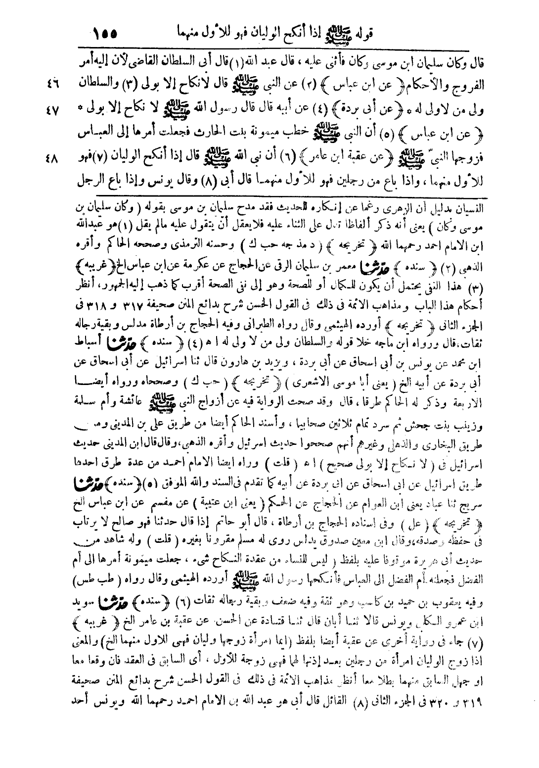 قال وكان سليمان ابن موسى وكان فأثنى عليه، قال عبد الله (1) قال أبى السلطان القاضى لأن إليه أمر الفروج والأحكام (عن ابن عباس) (2) عن النبى صلى الله عليه وسلم قال لا نكاح إلا بولى (3) والسلطان ولى من لا ولى له * (عن أبى بردة) (4) عن أبيه قال قال رسول الله صلى الله عليه وسلم لا نكاح إلا بولى * (عن ابن عباس) (5) أن النبى صلى الله عليه وسلم خطب ميمونة بنت الحارث فجعلت أمرها إلى العباس فزوجها النبىّ صلى الله عليه وسلم (عن عقبة ابن عامر) (6) أن نبى الله صلى الله عليه وسلم قال إذا أنكح الوليان (7) فهو للأول منهما، واذا باع من رجلين فهو للأول منهما قال أبى (8) وقال يونس وإذا باع الرجل