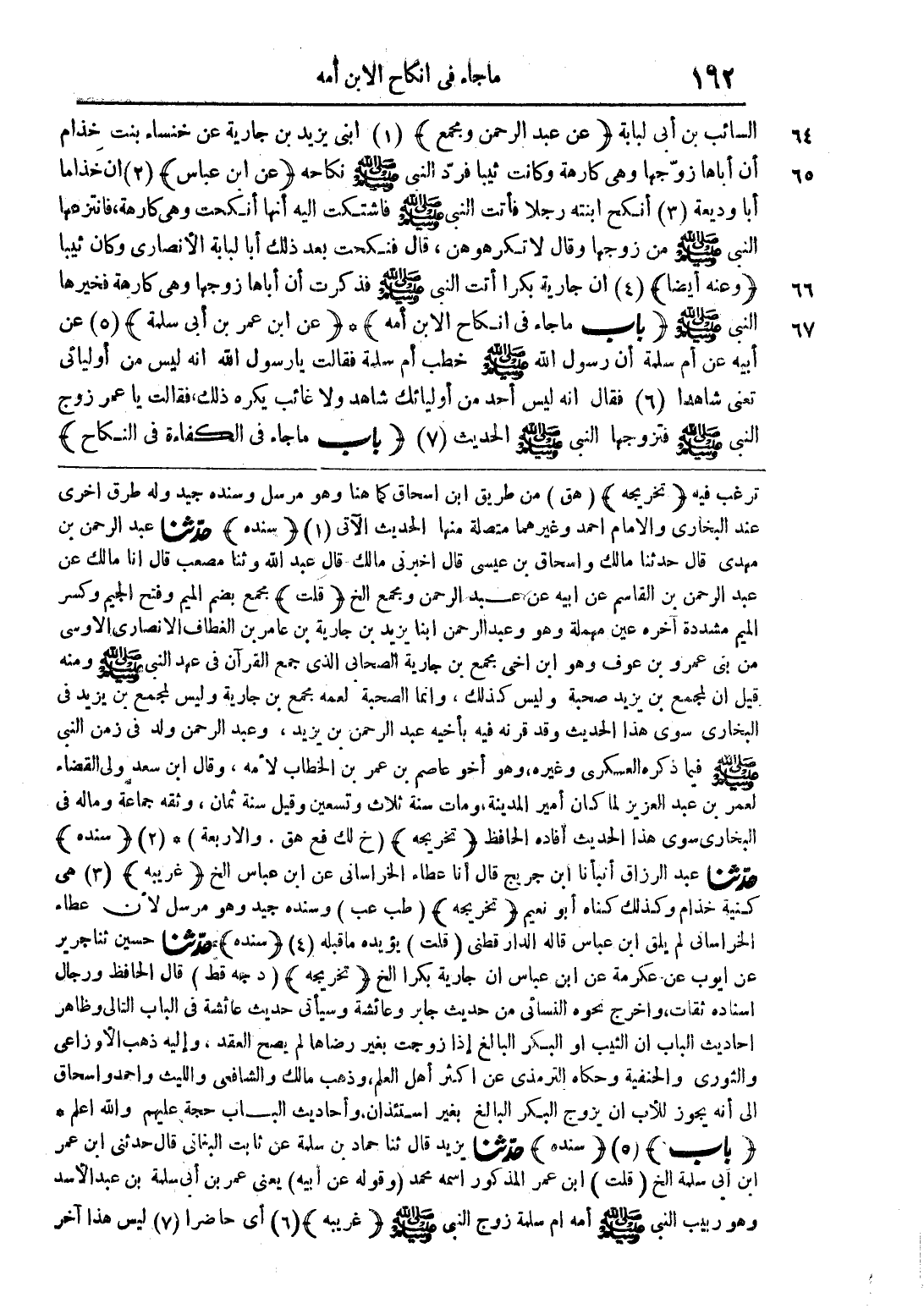 ترغب فيه (تخرجه) (هق) من طريق ابن إسحاق كما هنا وهو مرسل وسنده جيد وله طرق أخرى عند البخاري والإمام أحمد وغيرهما متصلة منها الحديث الآتي (1) (سنده) حدثنا عبد الرحمن بن مهدي قال حدثنا مالك وإسحاق بن عيسى قال أخبرني مالك قال عبد الله وثنا مصعب قال أنا مالك عن عبد الرحمن بن القاسم عن أبيه عن عبد الرحمن ومجمع الخ (قلت) مجمع بضم الميم وفتح الجيم وكسر الميم ومشددة آخره عين مهملة وعبد الرحمن ابنا يزيد بن جارية بن عامر بن الغطاف الأنصاري الأوسي من بني عمرو بن عوف وهو ابن أخي مجمع بن جارية الصحابي الذي جمع القرآن في عهد النبي صلى الله عليه وسلم ومنه قيل أن لمجمع بن يزيد صحبة وليس كذلك، وإنما الصحبة لعمه مجمع بن جارية وليس لمجمع بن يزيد في البخاري سوى هذا الحديث وقد قرنه فيه بأخيه عبد الرحمن بن يزيد، وعبد الرحمن ولد في زمن النبي صلى الله عليه وسلم فيما ذكره العسكري وغيره، وهو أخو عاصم بن عمر بن الخطاب لأمه، وقال ابن سعد ولي القضاء لعمرو بن عبد العزيز لما كان أمير المدينة، ومات سنة ثلاث وتسعين وقيل سنة ثمان، وثقه جماعة وماله في البخاري سوى هذا الحديث أفاده الحافظ (تخريجه) (خ لك فع هق، والأربعة) * (2) (سنده) حدثنا عبد الرازق أنبأنا ابن جريج قال أنا عطاء الخراساني عن ابن عباس الخ (غريبة) (3) هي كنية خدام وكذلك كناه أو نعيم (تخريحه) (طب عن) وسنده جيد وهو مرسل لأن عطاء الخراساني لم يلق ابن عباس قال الدارقطني (قلت) يؤيده ما قبله (4) (سنده) حدثنا حسين ثنا جرير عن أيوب عن عكرمة عن ابن عباس أن جارية بكرا إلخ (تخريجه) (د جه قط) قال الحافظ ورجال إسناده ثقات، واخرج نحوه النسائي من حديث جابر وعائشة وسيأتي حديث عائشة في الباب التالي وظاهر أحاديث الباب أن الثيب أو البكر البالغ إذا تزوجت بغير رضاها لم يصح العقد، وإليه ذهب الأوزاعى والثوري والحنفية وحكاه الترمذي عن أكثر أهل العلم، وذهب مالك والشافعي والليث وأحمد إسحاق إلى أنه يجوز للأب أن يزوج البكر البالغ بغير استئذان، وأحاديث الباب حجة عليهم والله أعلم (باب) (5) (سنده) حدثنا يزيد قال ثنا حماد بن سلمة عن ثابت البغاني قال حدثني ابن عمر ابن أبي سلمة الخ (قلت) ابن عمر المذكور أسمه محمد (وقوله عن أبيه) يعني عمر بن أبي سلمة بن عبد الأسد وهو ربيب النبي صلى الله عليه وسلم أمه أم سلمة زوج النبي صلى الله عليه وسلم (غريبة) (6) أي حاضراً (7) ليس هذا آخر