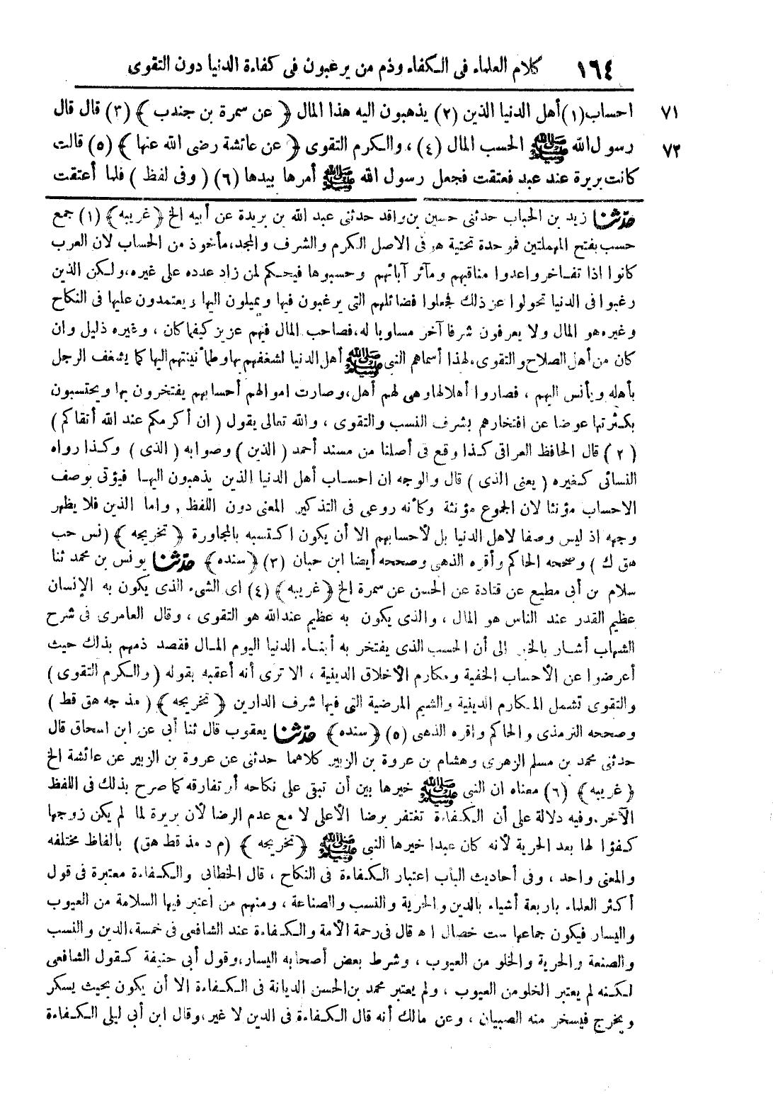 أحساب (1) أهل الدنيا الذين (2) يذهبون إليه هذا المال (عن سمرة بن جندب) (3) قال قال رسول الله صلى الله عليه وسلم الحسب المال (4)، والكرم التقوى (عن عائشة رضي الله عنها) (5) قالت كانت بريرة عند عبد فعتقت فجعل رسول الله صلى الله عليه وسلم أمرها بيدها (6) (وفي لفظ) فلما أعتقت