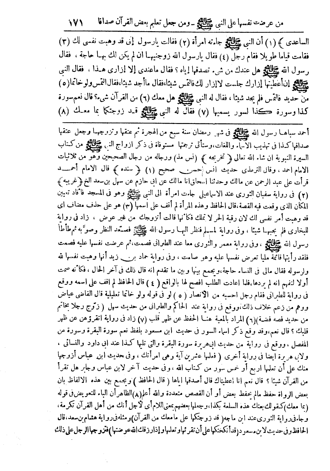 الساعدي) (1) أن النبي صلى الله عليه وسلم جاءته امرأة (2) فقال يا رسول إني قد وهبت نفسي لك (3) فقامت قياماً طويلاً فقام رجل (4) فقال يا رسول الله زوجنيها أن لم يكن لك بها حاجة، فقال رسول الله صلى الله عليه وسلم هل عندك من شيء تصدقها إياه؟ فقال ما عندي إلا إزاري هذا، فقال النبي صلى الله عليه وسلم إن أعطيتها إزارك جلست لا إزار لك فالتمس شيئاً، فقال ما أجد شيئاً، فقال التمس ولوخاتماً (5) من حديد فالتمس فلم يجد شيئاً، فقال له النبي صلى الله عليه وسلم هل معك (6) من القرآن شيء؟ قال نعم سورة كذا وسورة كذا لسور يسميها (7) فقال له النبي صلى الله عليه وسلم قد زوجتكما بما معك (8)