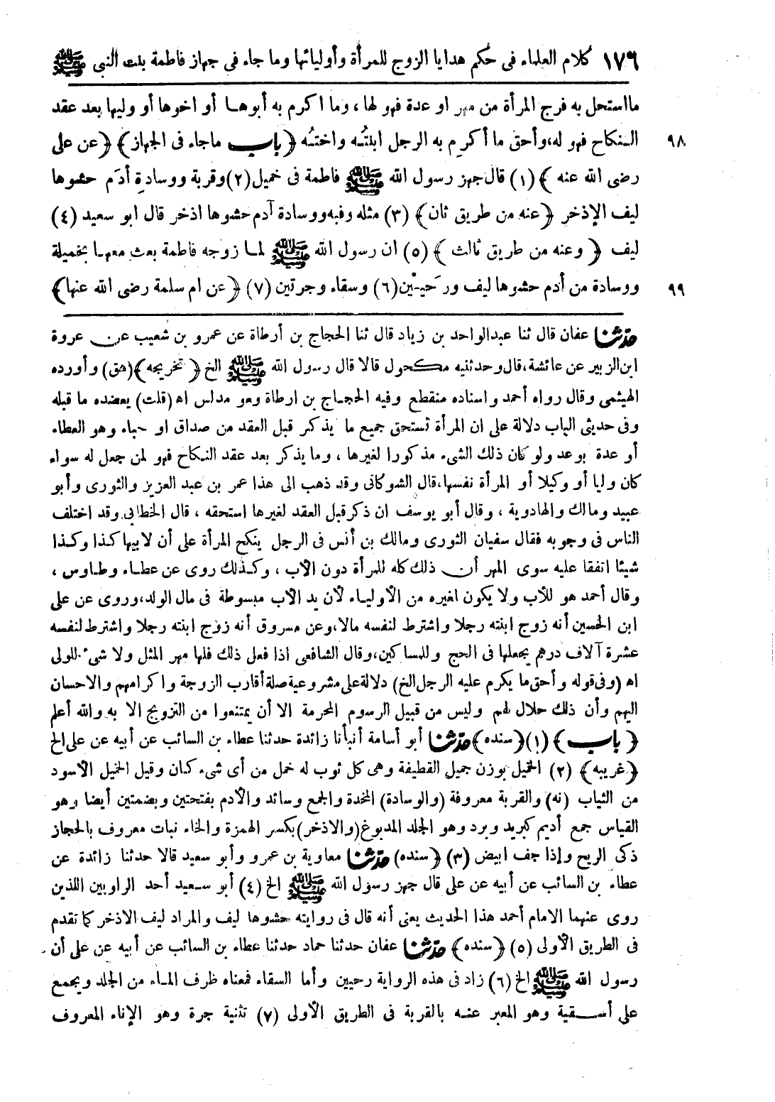 ما استحل به فرج المرأة من مهر أو عدة فهو لها، وما أكرم به أبوها أو أخوها أو وليها بعد عقد النكاح فهو له، وأحق ما أكرم به الرجل ابنته وأخته (باب ما جاء في الجهاز) (عن علي رضي الله عنه) (1) قال جهز رسول الله صلى الله عليه وسلم فاطمة في خميل (2) وقربة ووسادة أدن وحشوها ليف الإذخر (عنه من طريق ثان) (3) مثله وفيه ووسادة آدم وحشوها أذخر قال أبو سعيد (4) ليف (وعنه من طريق ثالث) (5) أن رسول الله صلى الله عليه وسلم لما زوجه فاطمة بعث معها بخميلة ووسادة من أدم وحشوها ليف ورحيين (6) وجرتين (7) (عن أم سلمة رضي الله عنها)
