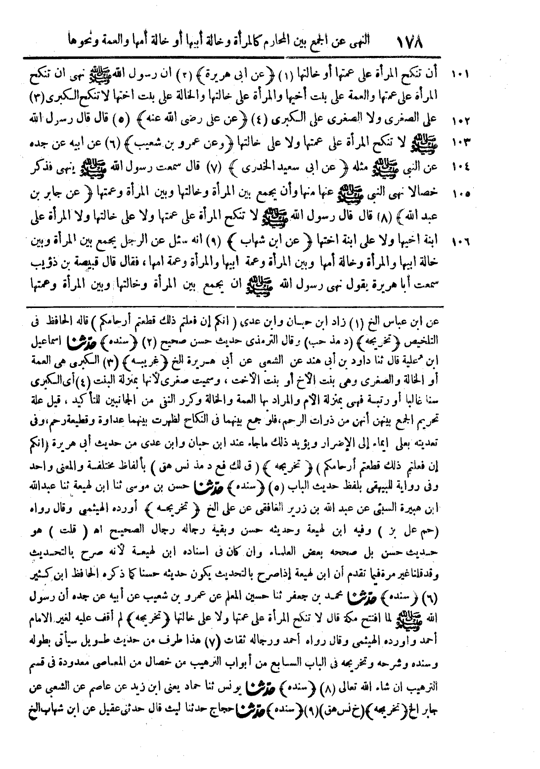 أن تنكح المرأة على عمتها أو خالتها (1) (عن أبى هريرة) (2) أن رسول الله صلى الله عليه وسلم نهى أن تنكح المرأة على عمتها والعمة على بنت أخيها والمرأة على خالتها والخالة على بنت أختها لا تنكح الكبرى (3) على الصغرى ولا الصغرى على الكبرى (4) (عن علي رضي الله عنه) (5) قال قال رسول الله صلى الله عليه وسلم لا تنكح المرأة على عمتها ولا على خالتها (وعن عمرو بن شعيب) (6) عن ابيه عن جده عن النبي صلى الله عليه وسلم مثله (عن ابي سعيد الخدري) (7) قال سمعت رسول الله صلى الله عليه وسلم ينهى فذكر خصالا نهى النبي صلى الله عليه وسلم عنها منها وأن يجمع بين المرأة وخالتها وبين المرأة وعمتها (عن جابر بن عبد الله) (8) قال قال رسول الله صلى الله عليه وسلم لا تنكح المرأة على عمتها ولا على خالتها ولا المرأة على ابنة أخيها ولا ابنة أختها (عن ابن شهاب) (9) أنه سئل عن الرجل يجمع بين المرأة وبين خالة أبيها والمرأة وخالة أمها وبين المرأة وعمة أبيها والمرأة وعمة أمها، فقال قال قبيصة بن ذؤيب سمعت أبا هريرة يقول نهى رسول الله صلى الله عليه وسلم أن يجمع بين المرأة وخالتها وبين المرأة وعمتها