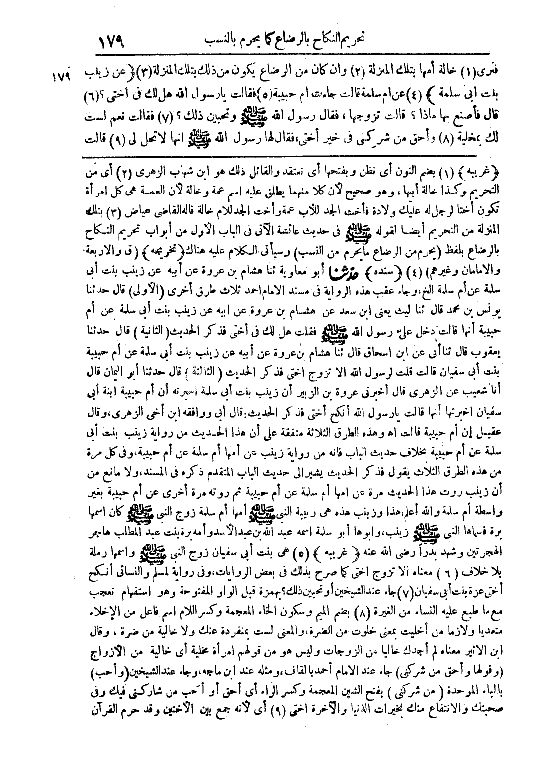 (غريبه) (1) بضم النون أي نظن وبفتحها أي نعتقد والقائل ذلك هو ابن شهاب الزهري (2) أي من التحريم وكذا خالة أبيها، وهو صحيح لأن كلا منهما يطلق عليه اسم عمة وخالة لأن العمة هي كل امرأة تكون أختا لرجل له عليك ولادة فأخت الجد للأب عمة وأخت الجد للأم خالة قاله القاضي عياض (3) بتلك المنزلة من التحريم أيضا لقوله صلى الله عليه وسلم في حديث عائشة الآتي في الباب الأول من أبواب تحريم النكاح بالرضاع بلفظ (يحرم من الرضاع ما يحرم من النسب) وسيأتي الكلام عليه هناك (تخريجه) (ق والأربعة والإمامان وغيرهم) (4) (سنده) حدثنا أبو معاوية ثنا هشام بن عروة عن أبيه عن زينب بنت أبي سلمة عن أم سلمة الخ، وجاء عقب هذه الرواية في مسند الإمام احمد ثلاث طرق أخرى (الأولى) قال حدثنا يونس بن محمد قال ثنا ليث يعنى ابن سعد عن هشام بن عروة عن ابيه عن زينب بنت أبي سلمة عن أم حبيبة أنها قالت دخل على رسول الله صلى الله عليه وسلم فقلت هل في أختي فذكر الحديث (الثانية) قال حدثنا يعقوب قال ثنا أبي عن ابن إسحاق قال ثنا هشام بن عروة عن أبيه عن زينب بنت أبي سلمة عن أم حبيبة بنت أبي سفيان قالت قلت لرسول الله ألا تزوج أختي فذكر الحديث (الثالثة) قال حدثنا أبو اليمان قال أنا شعيب عن الزهري قال أخبرني عروة بن الزبير أن زينب بنت أبي سلمة أخبرته أن أم حبيبة ابنة أبي سفيان أخبرتها أنها قالت يا رسول الله أنكح أختي فذكر الحديث: قال أبي ووافقه ابن أخي الزهري، وقال عقيل إن أم حبيبة قالت اهـ وهذه الطرق الثلاثة متفقة على أن هذا الحديث من رواية زينب بنت أبي سلمة عن أم حبيبة بخلاف حديث الباب فانه من رواية زينب عن أمها أم سلمة عن أم حبيبة، وفى كل مرة من هذه الطرق الثلاث يقول فذكر الحديث يشير الى حديث الباب المتقدم ذكره في المسند، ولا مانع من أن زينب روت هذا الحديث مرة عن أمها أم سلمة عن أم حبيبة ثم روته مرة أخرى عن أم حبيبة بغير واسطة أم سلمة والله أعلم، هذا وزينب هذه هي ربيبة النبي صلى الله عليه وسلم أمها أم سلمة زوج النبي صلى الله عليه وسلم كان اسمها برة فسماها النبي صلى الله عليه وسلم زينب، وأبوها أبو سلمة اسمه عبد الله بن عبد الأسد وأمه برة بنت عبد المطلب هاجر الهجرتين وشهد بدرًا رضي الله عنه (غريبه) (5) هي بنت أبي سفيان زوج النبي صلى الله عليه وسلم واسمها رملة بلا خلاف (6) معناه ألا تزوج أختي كما صرح بذلك في بعض الروايات، وفي رواية لمسلم والنسائي أنكح أختي عزة بنت أبي سفيان (7) جاء عند الشيخين أو تحبين ذلك؟ بهمزة قبل الواو المفتوحة وهو استفهام تعجب مع ما طبع عليه النساء من الغيرة (8) بضم الميم وسكون الخاء المعجمة وكسر اللام اسم فاعل من الإخلاء متعديا ولازما من أخليت بمعنى خلوت من الضرة، والمعنى لست بمنفردة عنك ولا خالية من ضرة، وقال ابن الأثير معناه لم أجدك خاليا من الزوجات وليس هو من قولهم امرأة مخلية أي خالية من الأزواج (وقولها وأحق من شر كنى) جاء عند الإمام أحمد بالقاف، ومثله عند ابن ماجه، وجاء عند الشيخين (وأحب) بالباء الموحدة (من شر كنى) بفتح الشين المعجمة وكسر الراء أي أحق أو أحب من شاركني فيك وفى صحبتك والانتفاع منك بخيرات الدنيا والآخرة أختي (9) أي لأنه جمع بين الأختين وقد حرم القرآن